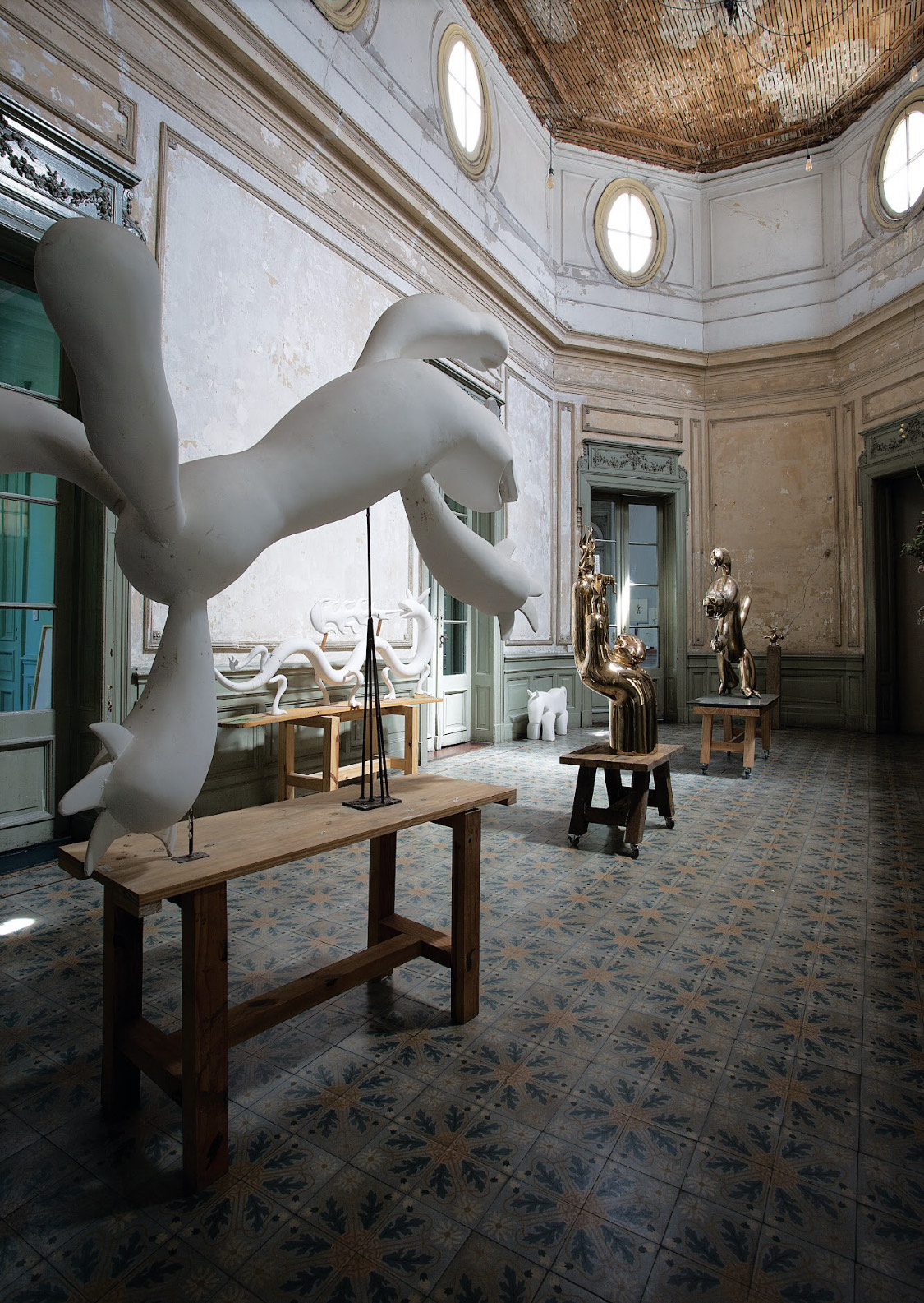 Pude ver que aquellos dolores y confusos recuerdos de mi infancia eran en verdad hermosos, únicos, pero también similares a los de los demás” describe Marcelo Burgos acerca de sus esculturas instaladas en esta casa de Barracas, construida para albergar una familia circa 1890 y luego transformada en hotel de inmigrantes.