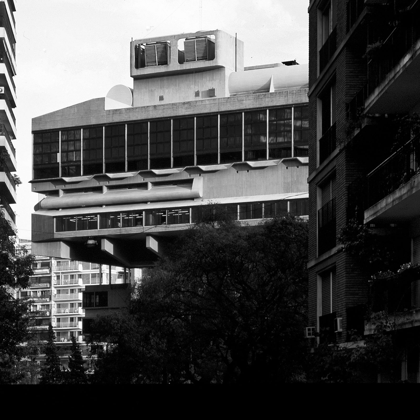 El brutalismo es un estilo arquitectónico que surgió en Reino Unido en la década de 1950. Se caracteriza por el uso predominante del hormigón, un enfoque en la funcionalidad y la falta de ornamentación. El estilo es conocido por su apariencia cruda y brutal, de ahí su nombre. Pero Clorindo Testa le dio un toque personal inconfundible, sustentado en una sensibilidad artística que convierte sus edificios además en poderosas esculturas. Todas dialogan con el espacio que habitan, expandiéndolo. Es el caso de este edificio, que continúa el paseo por los bosques que bajan hacia el río, y filtra entre su cuerpo las arquitecturas vecinas.