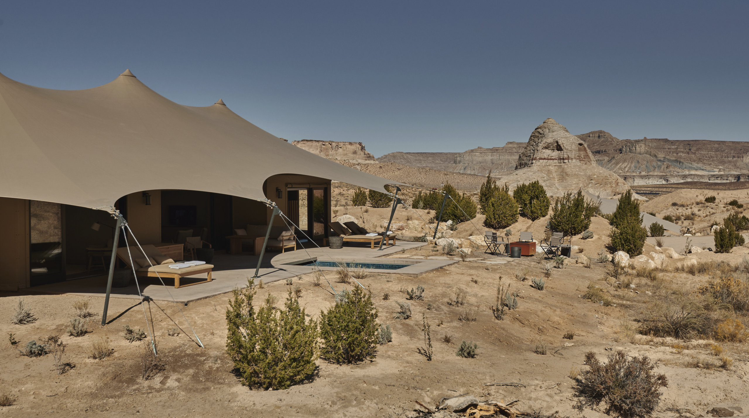 El nuevo campamento tiene 55 hectáreas vírgenes a cinco minutos en auto de su icónico resort hermano: Amangiri. Los huéspedes disfrutan de acceso completo a las instalaciones del resort cuando lo deseen, pero todo lo que necesitan está en Camp Sarika. Con impresionantes vistas, el campamento esta compuesto por diez tiendas de lujo, cada una con su propio deck y piscina privada, ubicadas estratégicamente para proporcionar el máximo aislamiento.