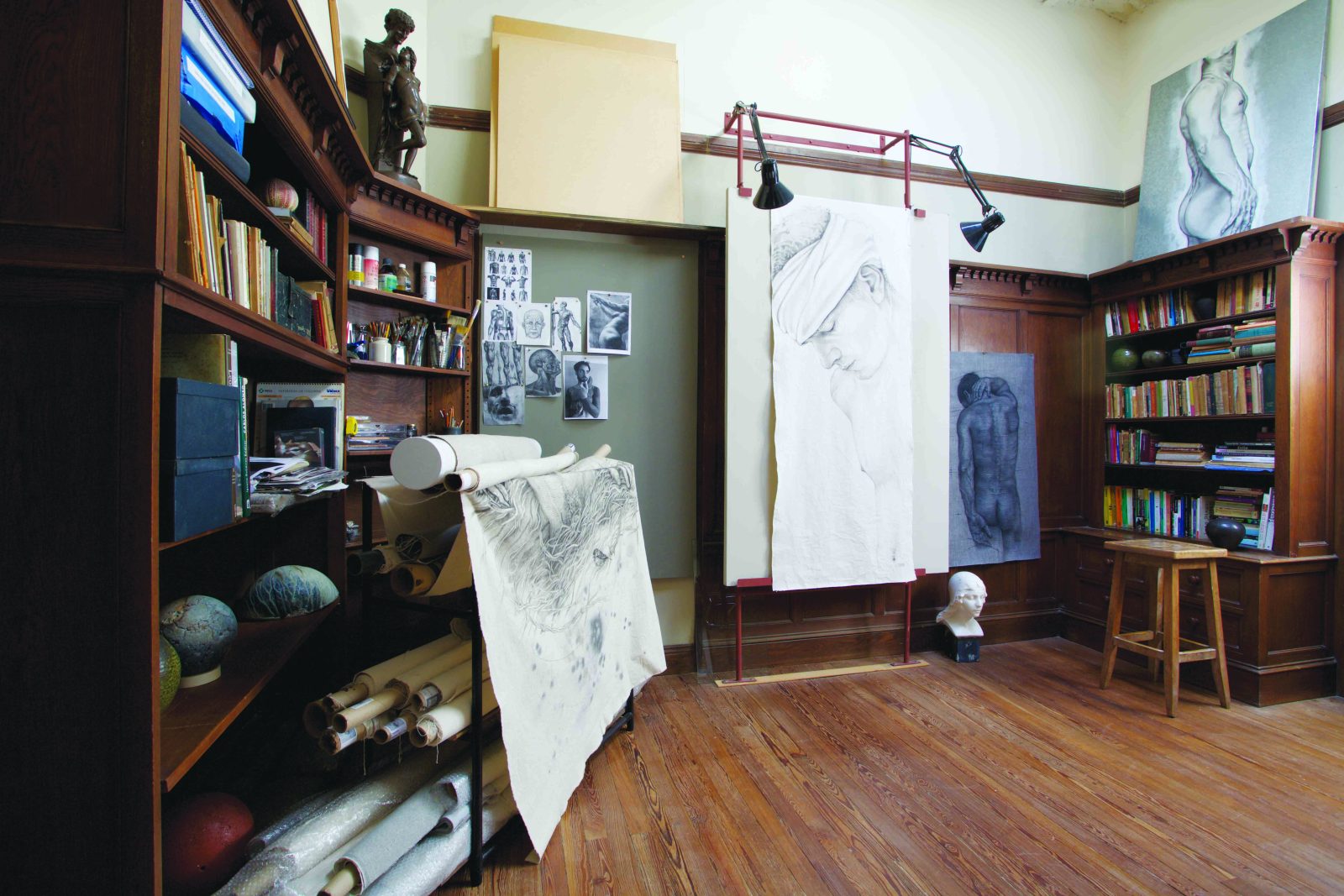 Vista de un rincón del atelier, con escritorio y biblioteca. “Más libros, más bronces, más dibujos y materiales… es un pequeño lugar dentro de mi taller donde trabajo con mi computadora”.