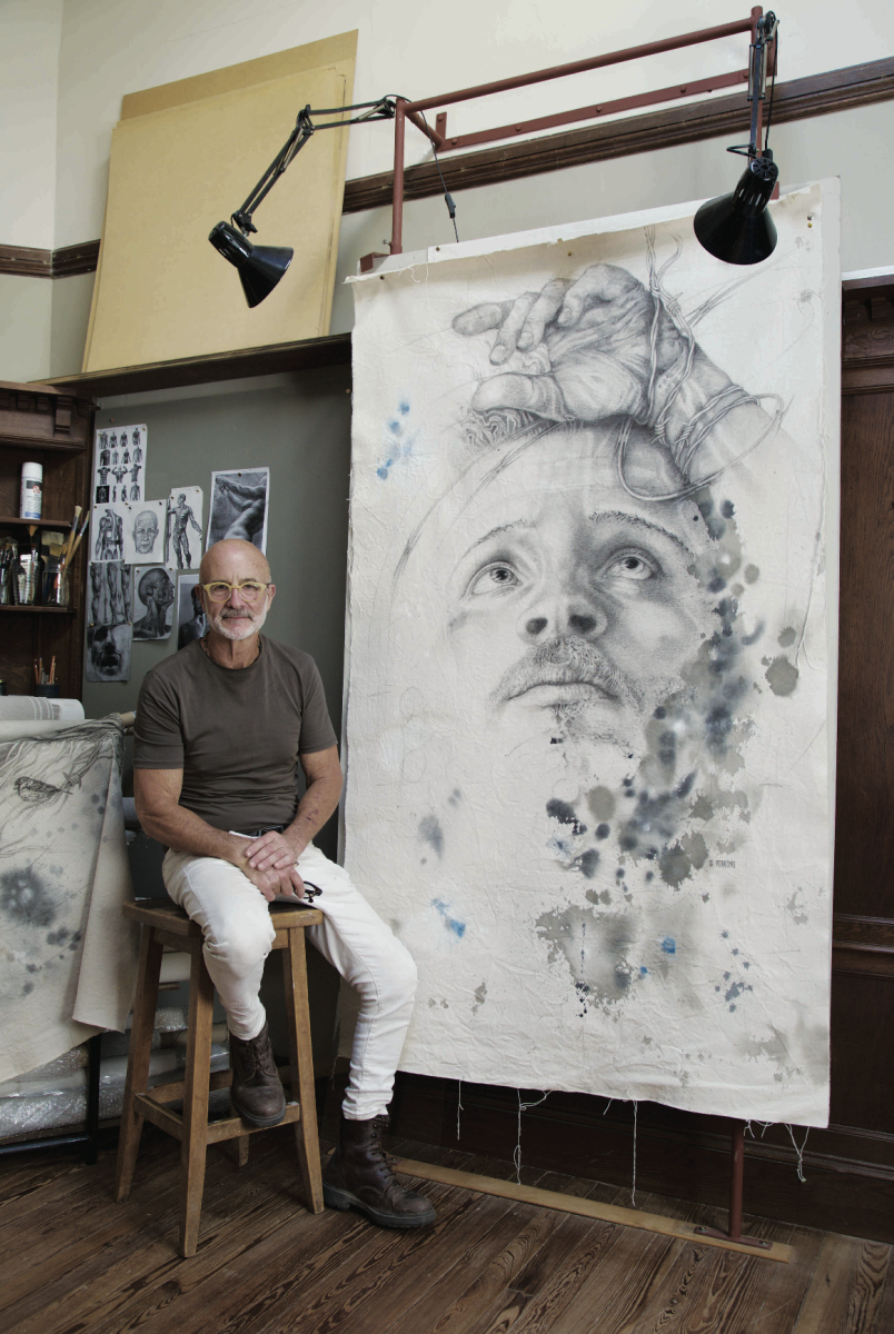 Arriba, Gabriel Perrone en su estudio, con un trabajo en proceso (dibujo en tiza, carbonilla y tinta sobre lienzo). En el living: dos dibujos y un óleo de su autoría. En la sala color verde, un pastel del pintor Carlos Alonso, una cabeza en mármol del escultor Roberto Juan Capurro y un artefacto de luz art déco. En el espacio principal, “escultura de un gladiador, que junto a las que están sobre el hogar, forman parte de mi colección de bronces neoclásicos”, dice Perrone. Dentro de la chimenea, una pieza de Juan Perrone.