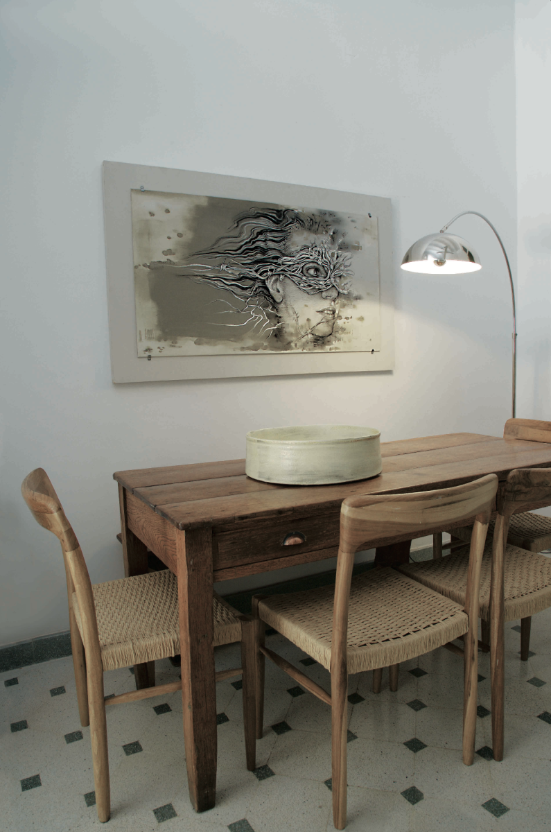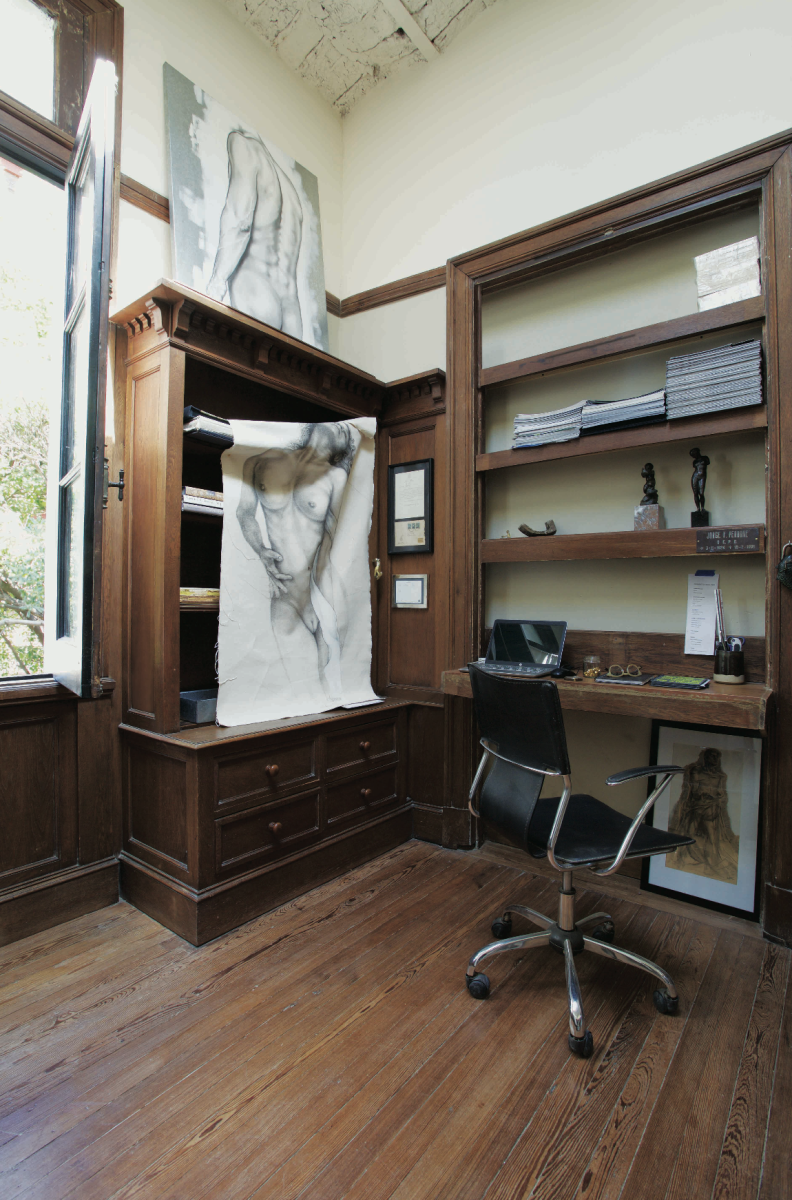 En su taller, donde trabaja, se pueden ver obras en lienzo intervenidas con tintas y carbonilla. “La boiserie es original de la casa. También las bibliotecas son originales en madera de roble y están llenas de libros de arte y otros que vienen de la biblioteca de mi padre”. Pisos en pinotea de origen.