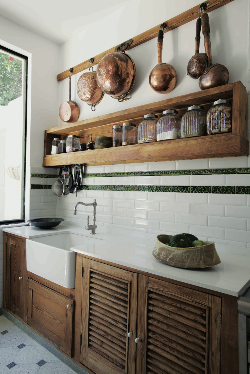 “Obra de mi autoría en acrílico y carbonilla sobre lienzo en el comedor diario”. Mesa en roble, con centro de Kumo Cerámica. Derecha: en la cocina, ollas antiguas de cobre y muebles de pinotea. Sobre la mesada, dos vasijas de Kumo Cerámica.