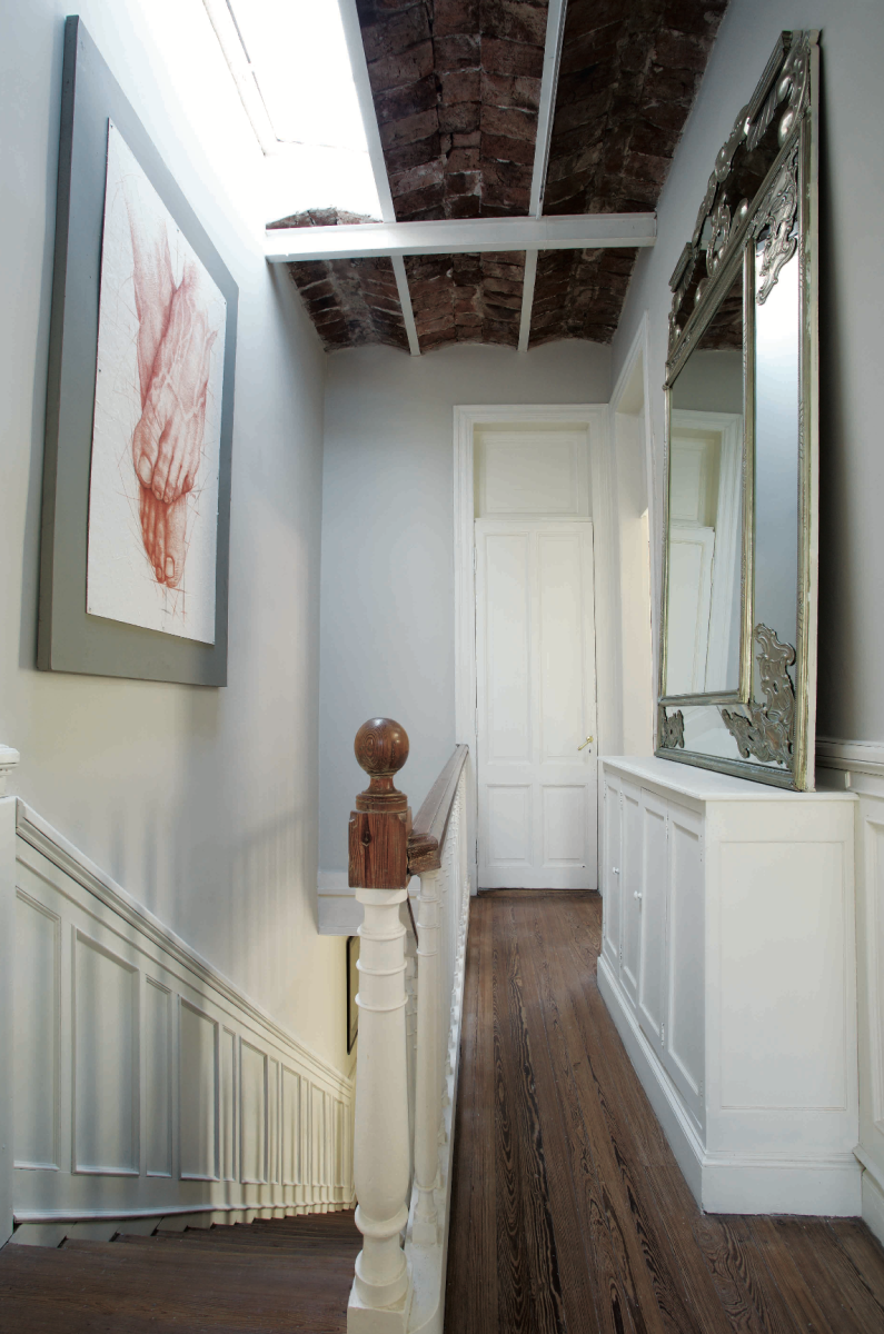 En el distribuidor del primer piso, una claraboya que da luz natural a todo el espacio. Sobre la pared, un dibujo en sanguina sobre lienzo del artista dueño de casa. Frente a este, espejo con marco labrado, “regalo de mi amigo Santiago Pipiu”.