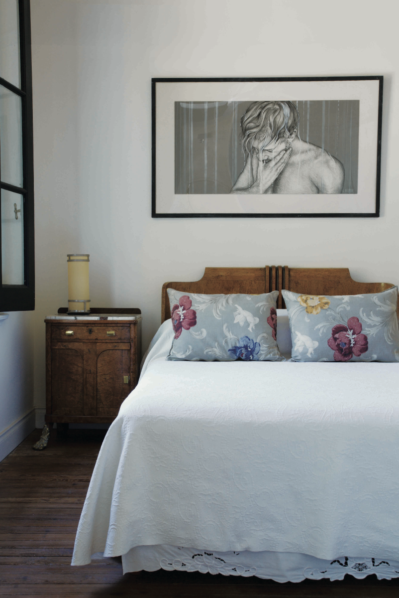 Dormitorio: cama con respaldo original art déco enchapado en raíz. Mesa de luz, mismo periodo y materiales. Arriba, obra de Perrone. Pisos de pinotea originales.