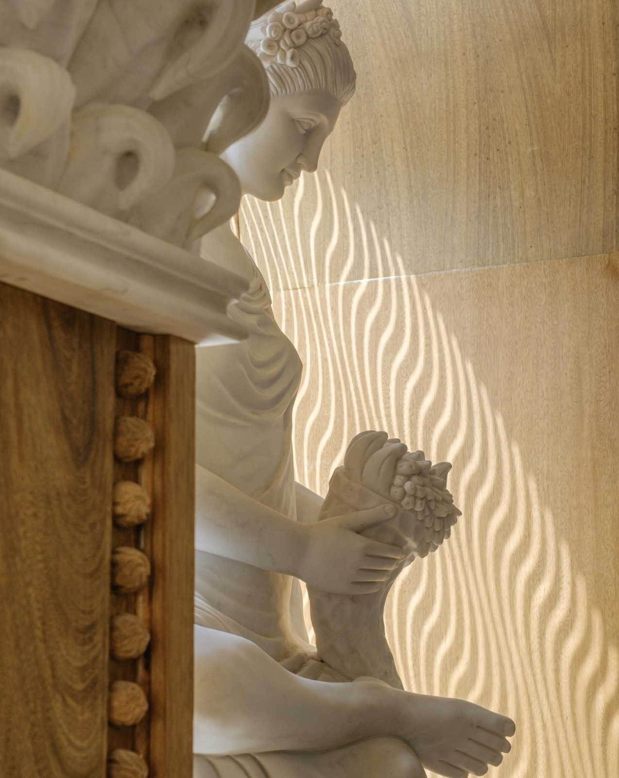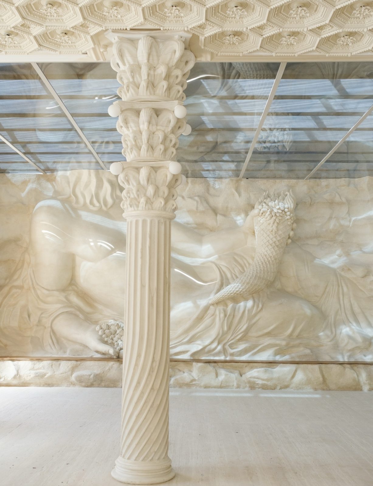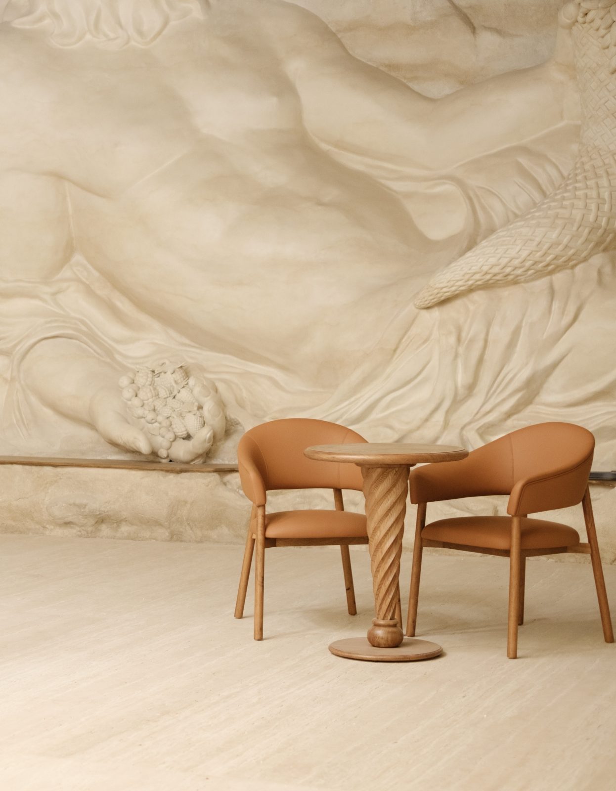 Esculturas de más de siete metros, frisos monumentales, capiteles de copos de helado y nichos con flores de cacao conviven con mobiliario inspirado en cucuruchos, bombones y jarrones que evocan sabores. Cada pieza es parte de una narrativa que deambula entre el drama, el romanticismo, la exageración y la ironía.