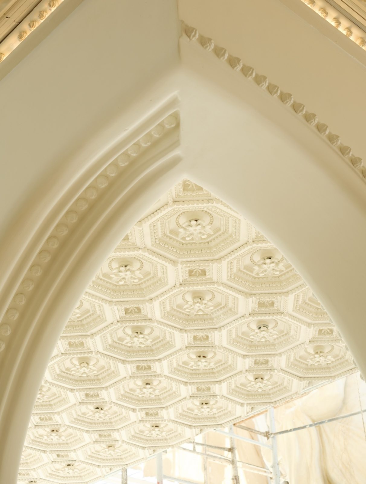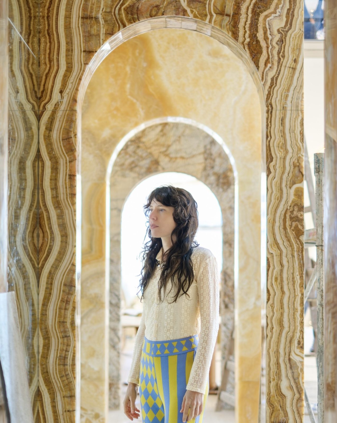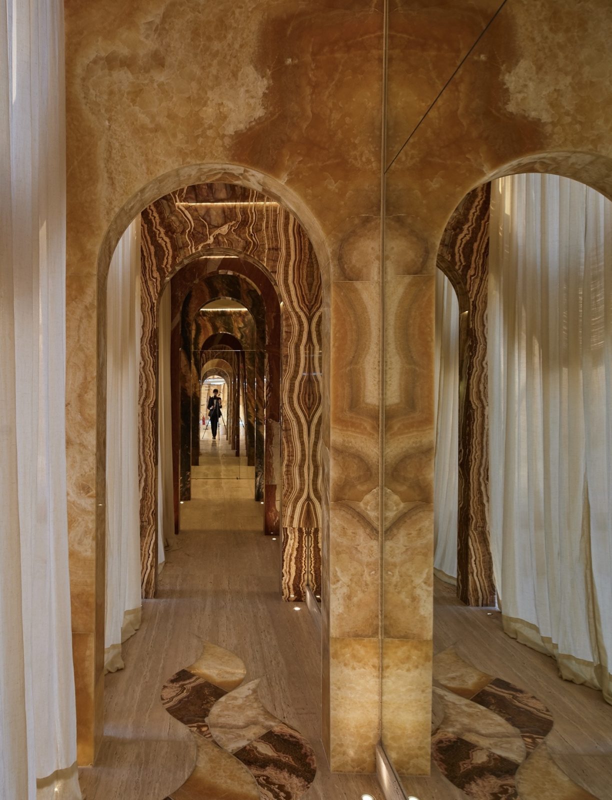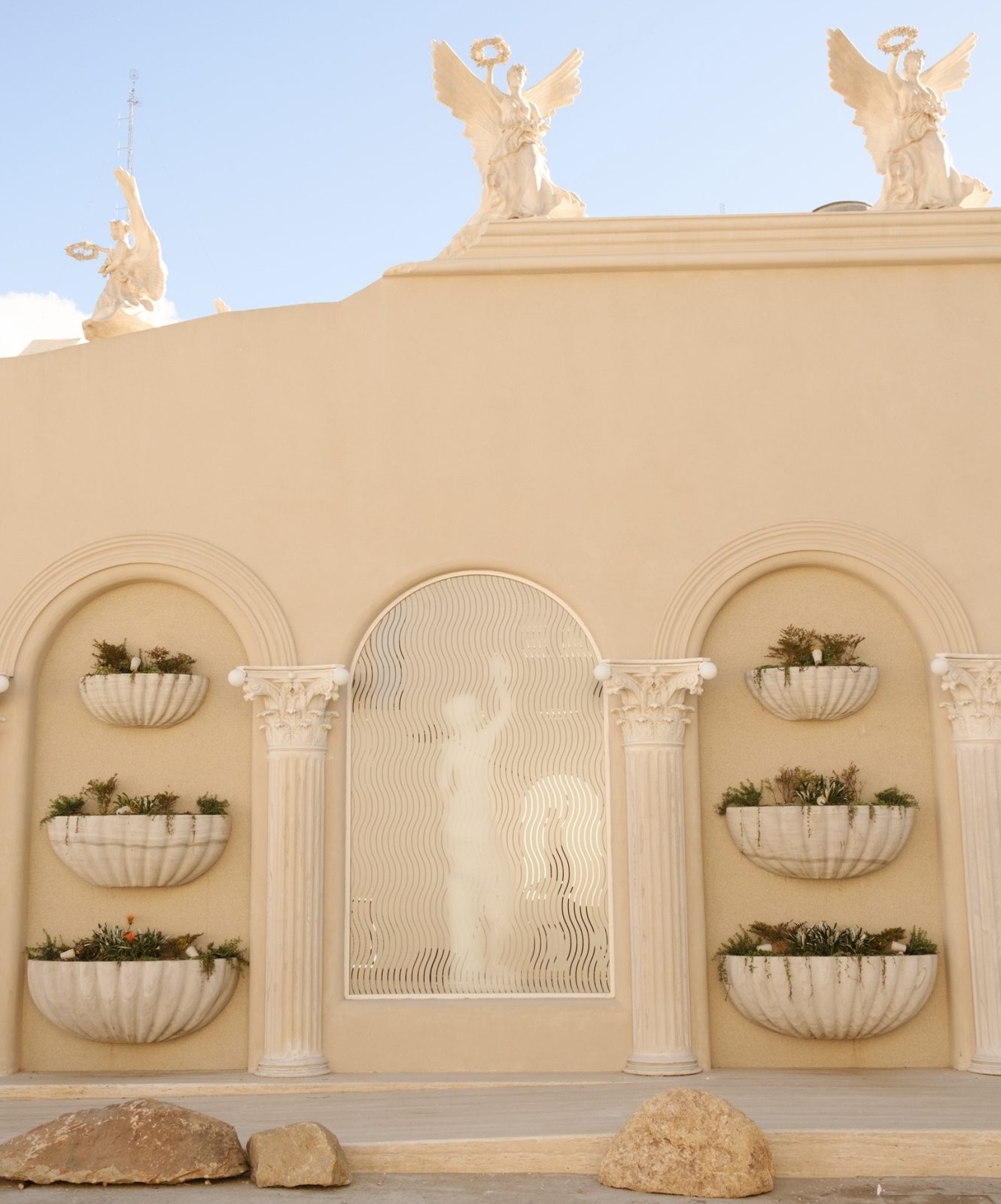 Esculturas de más de siete metros, frisos monumentales, capiteles de copos de helado y nichos con flores de cacao conviven con mobiliario inspirado en cucuruchos, bombones y jarrones que evocan sabores. Cada pieza es parte de una narrativa que deambula entre el drama, el romanticismo, la exageración y la ironía.