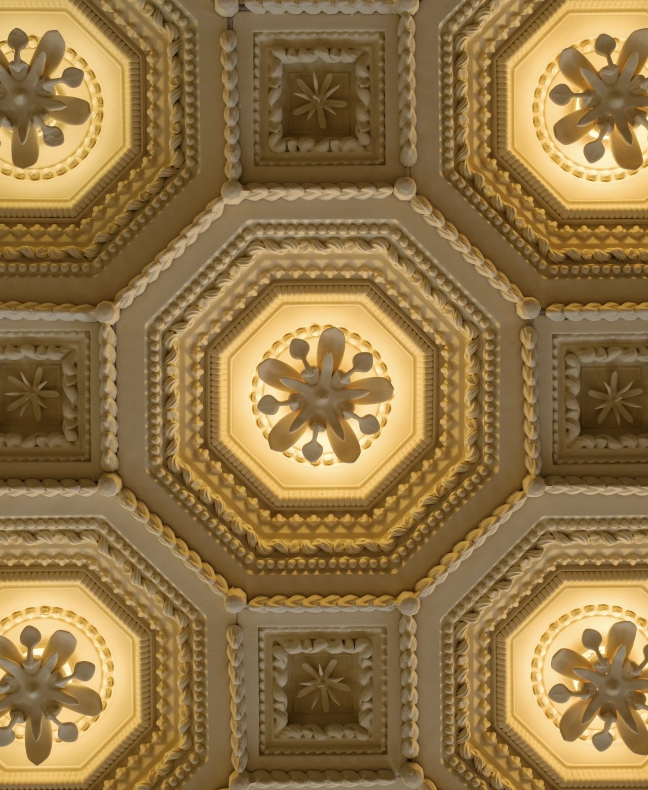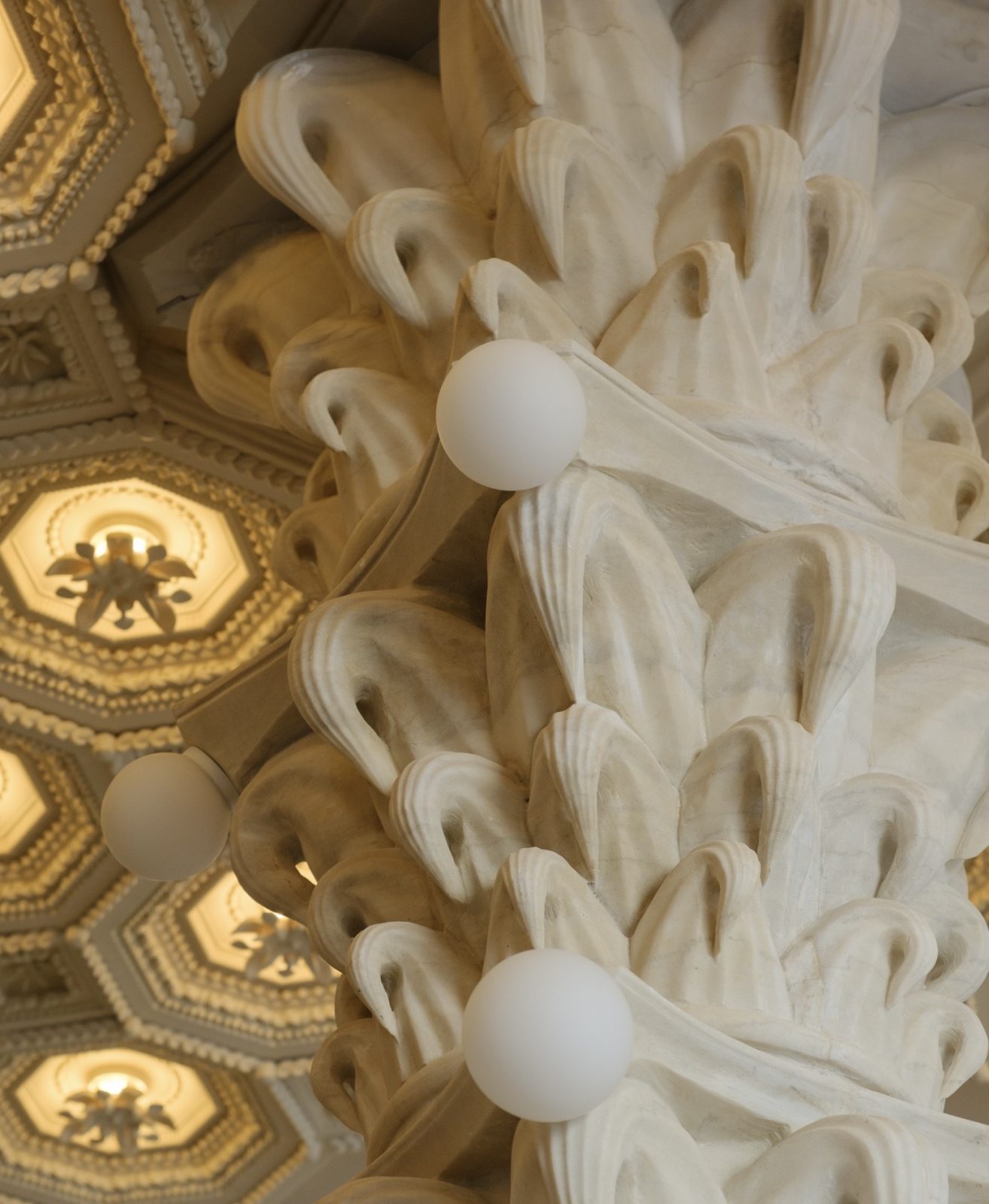 Molduras y capiteles en «crema» de mármol, mesas con base de cucuruchos de madera maciza, flores de cacao en resina, bombones de cemento, y una efigie monumental.