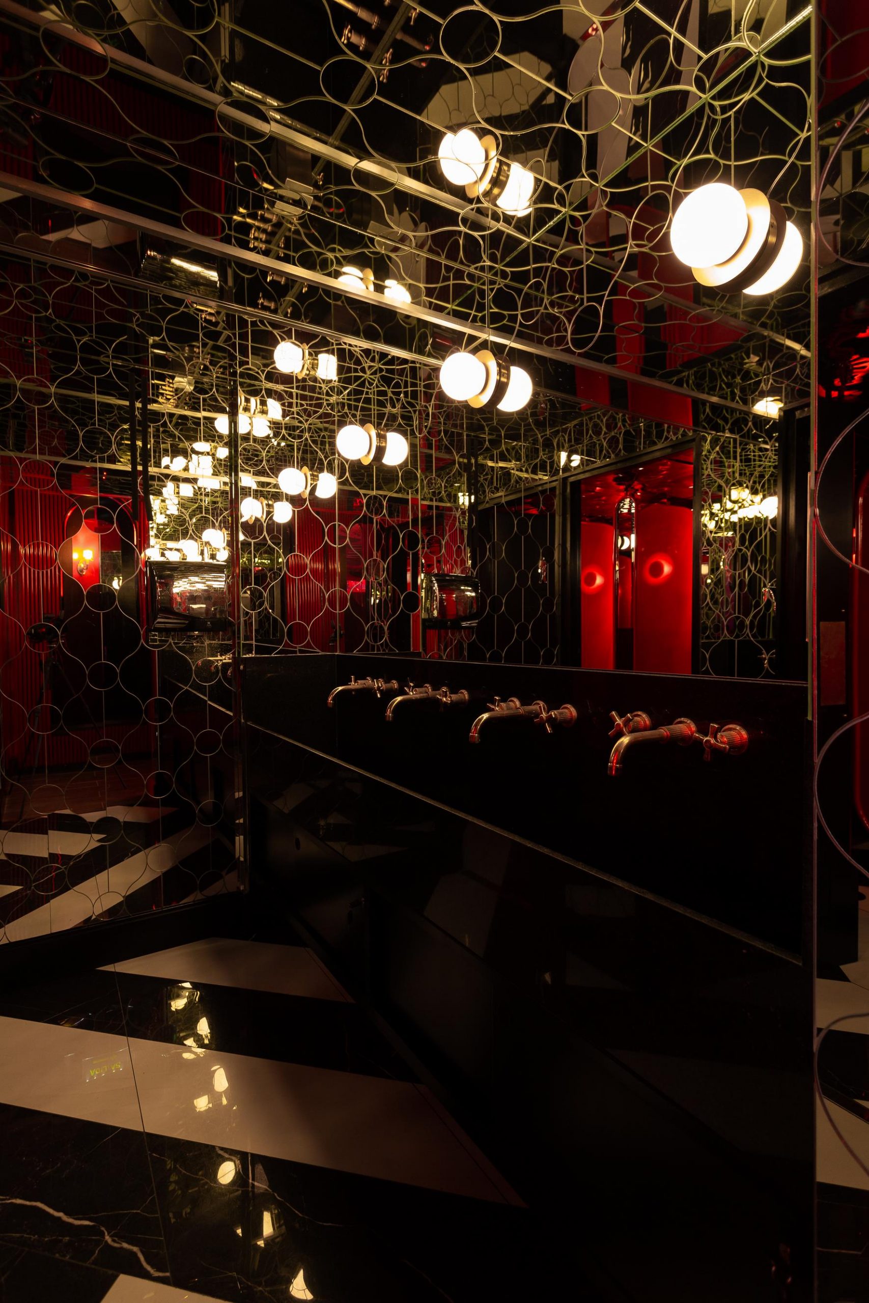 «El Baño nos costó muchísimo. Teníamos claro lo que queríamos pero no lográbamos hacerlo con los materiales que hay en el país. Incluso trajimos de Europa unos revolucionarios mingitorios, cada uno tiene su propia bacha. Todo empezó a acomodarse cuando descubrimos una joyita de espejero que a través de un proceso de termoformado hace que los espejos queden con una ondulación irregular que produce un efecto a agua y con la iluminación cualquier imagen se refleja hasta el infinito. Acero pintado a fuego en rojo matafuego con curvas enmarcan los compartimentos de cada uno de los baños. En las paredes 7 figuras en distintos tonos de espejos recortados forman un rompecabeza de amorfas figuras de piernas que se abren. Estas también fueron dibujadas por la multifacética artista Isa Garcia Calvo», revelan Lola, Paz y Agustina Caradonti.