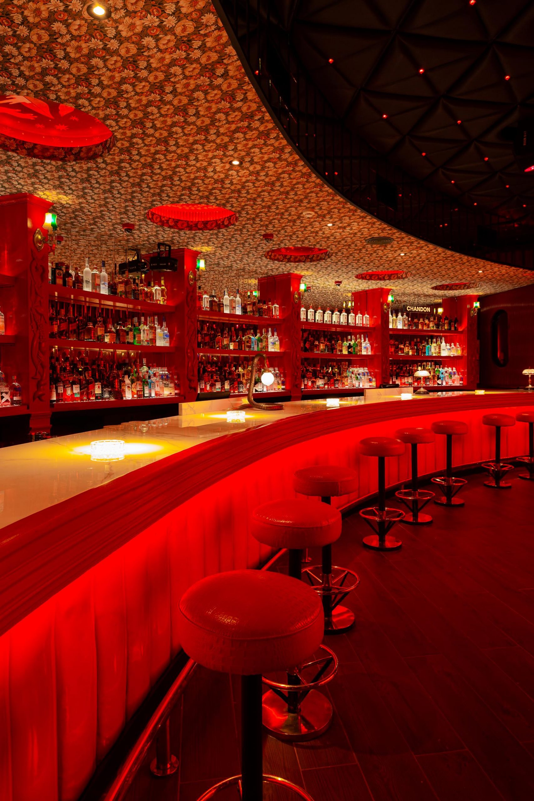 «La entrada tenía que generar deseo e intriga, la barra un lugar alquímico de transformación, los livings un espacio malcriado y cómodo, la pista un templo, el patio el edén, el vip un paraíso infernal al que aspirar, el baño un reset lisérgico. Y a partir de ahí creamos cada espacio, intentando que comulguen entre sí, unidos por un idioma en común, y por el color, pero distintos. Incluso hay un espacio ínfimo que es como un escondite secreto, para esos que quieren estar y no estar. Queríamos que fuera un lugar con personalidad, que mantuviese el espíritu, su impronta barroca francesa y su pretensión», describe Isabel Garcia Calvo desde donde se pensó el concepto de interiorismo de este mundo.