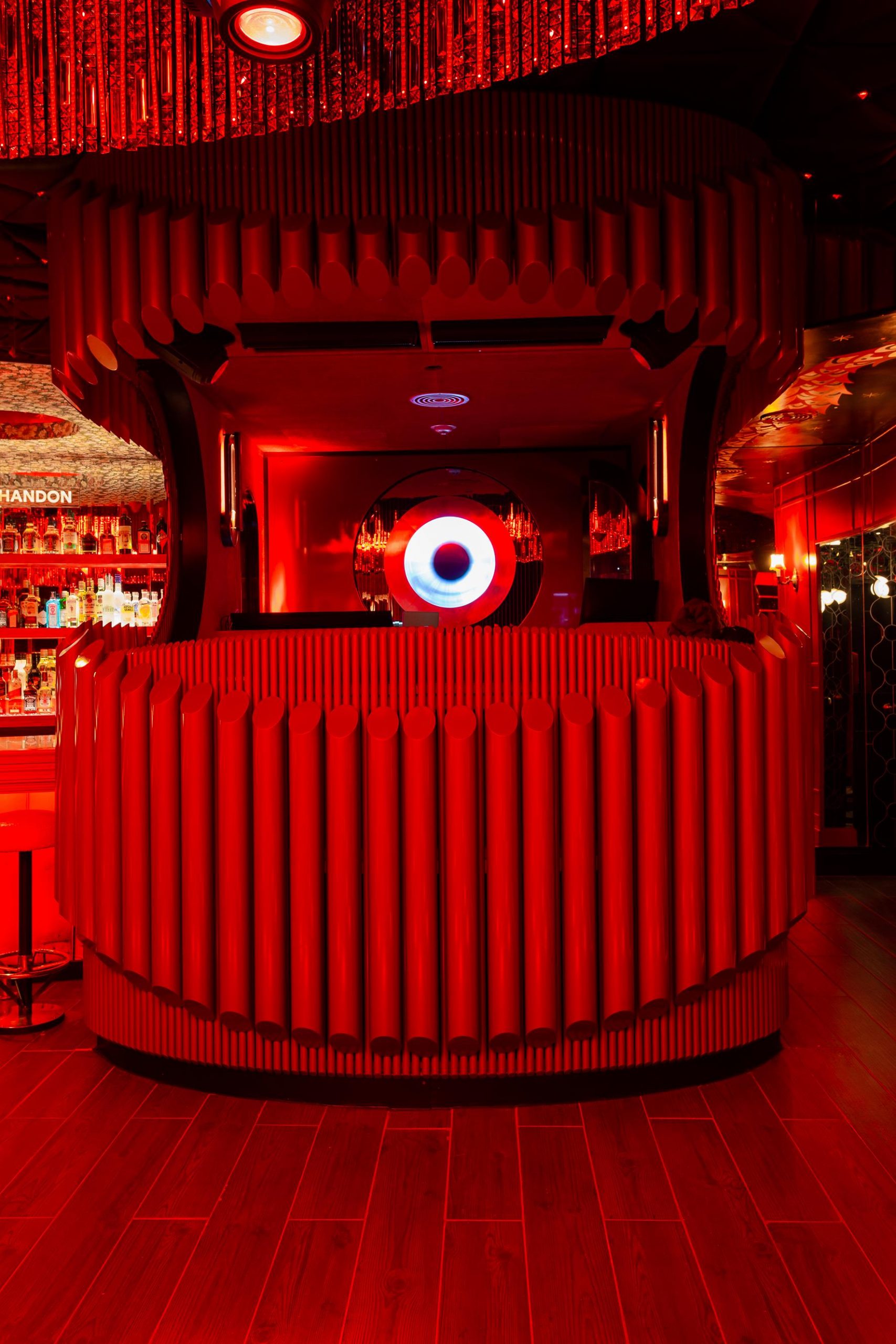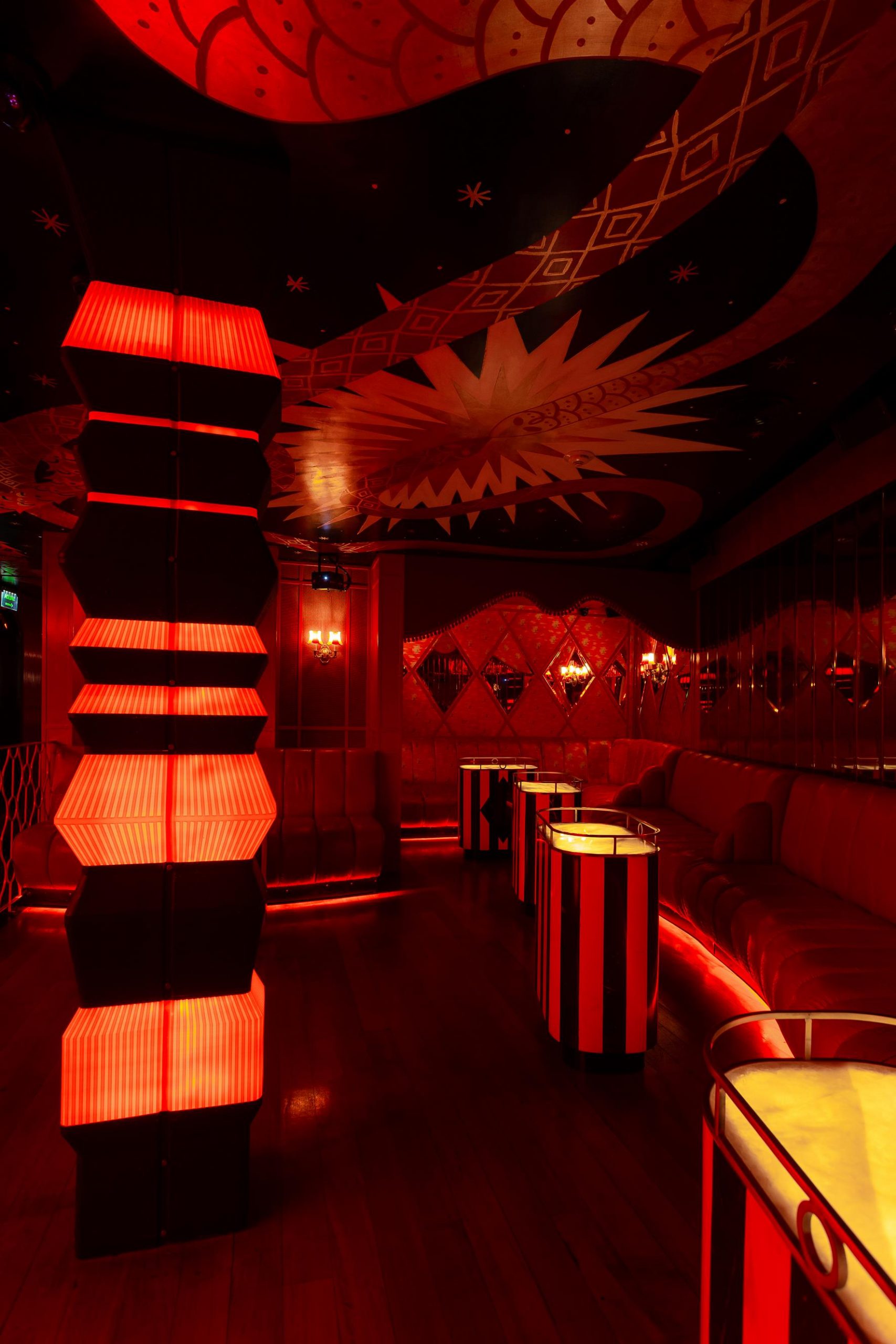 El Living lateral con su forma serpenteante tapizado en cuero rojo con tratamiento símil cocodrilo que va a lo largo de este espacio enmarcado por pantallas diseñadas por Luciano Levington que a lo largo de la noche te hipnotizan con imágenes variadas pensadas por la empresa Dumbo especialmente para Tq. Al final llegamos al que llamamos The Secret Room. Un pequeño espacio revestido por un genero de caras invertidas con fondo en rosa.