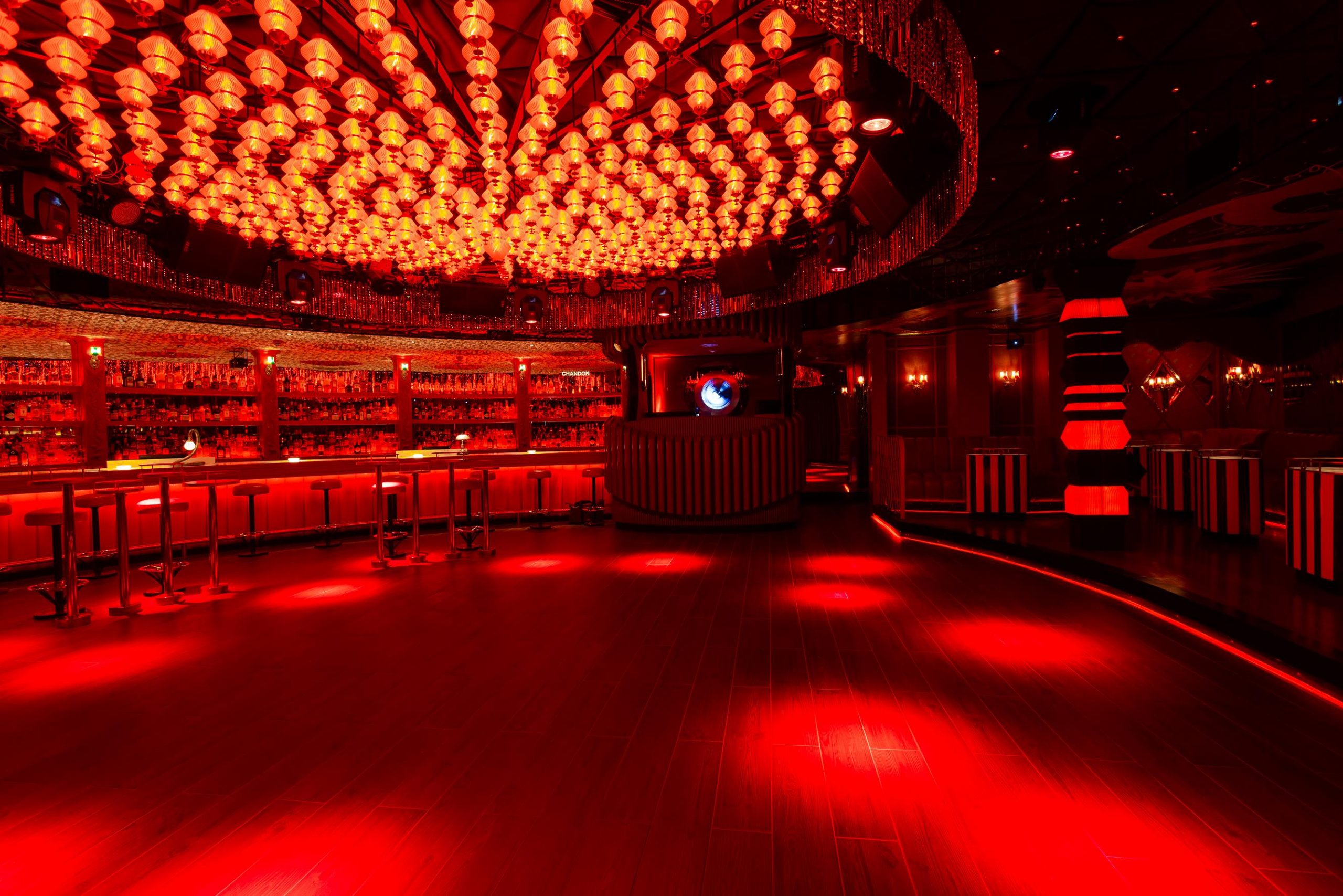 Tequila se dividió en 7 círculos, 7 espacios, así lo llaman. La fachada se recicló. Cuando llegas sigue estando el mítico toldo. La marquesina negra con el logo en el frente. Bordeada de 35 pantallas acrílicas de una antigua calesita de buenos aires. Una gran alfombra roja atraviesa este toldo dejándote ver al fondo el interior de este primer círculo. Medio circense, medio burdelesco.