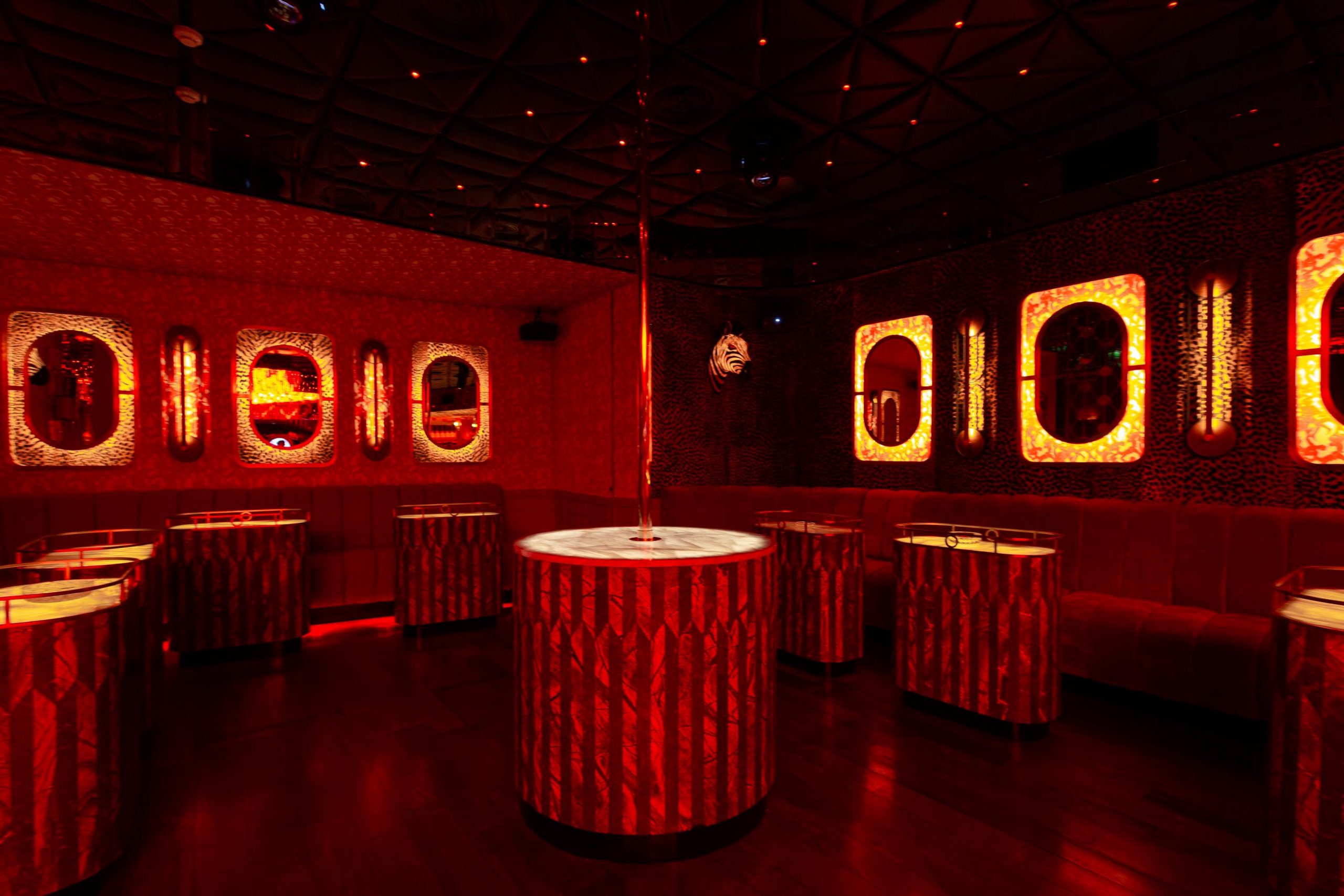 «El VIP se agrandó y se agregó un pole dance central. Realizamos una combinación de entelados después de una larga y ardua búsqueda. En uno de esos recorridos encontramos en Sederia José una joyita de Yves Saint Laurent que utilizamos para entelar junto a unos cueros de vaca con print de leopardo. Espejos con marco de bronce y apliques de Francisco Miranda. Dos cabezas de zebra realizadas en resina con luz en el interior terminan de lograr metrete en este mundo de fantasía. Todo esto contenido por unas estructuras de hierro y espejo que dan cierta intimidad y delimitan el espacio.