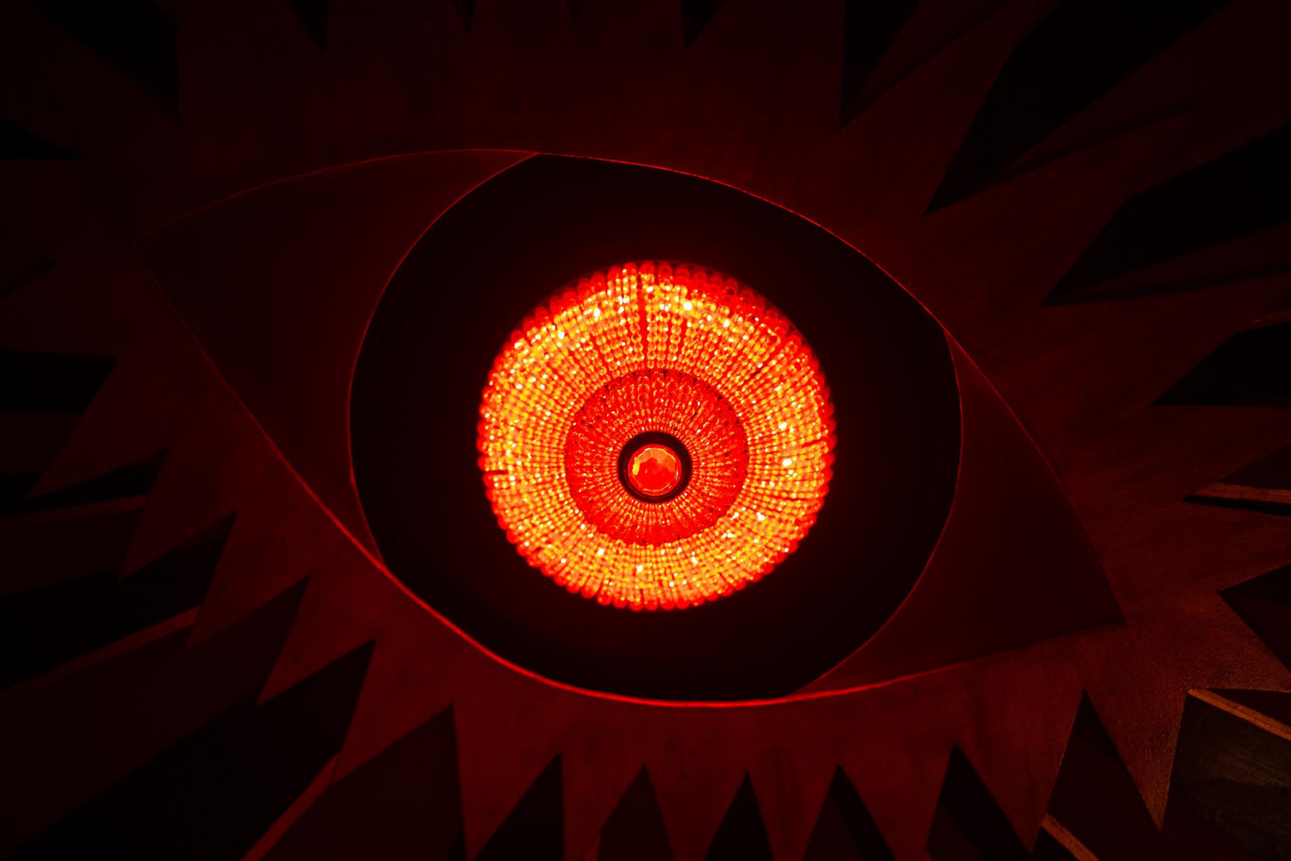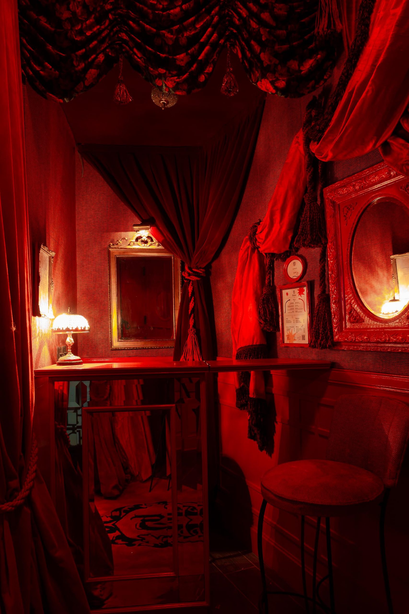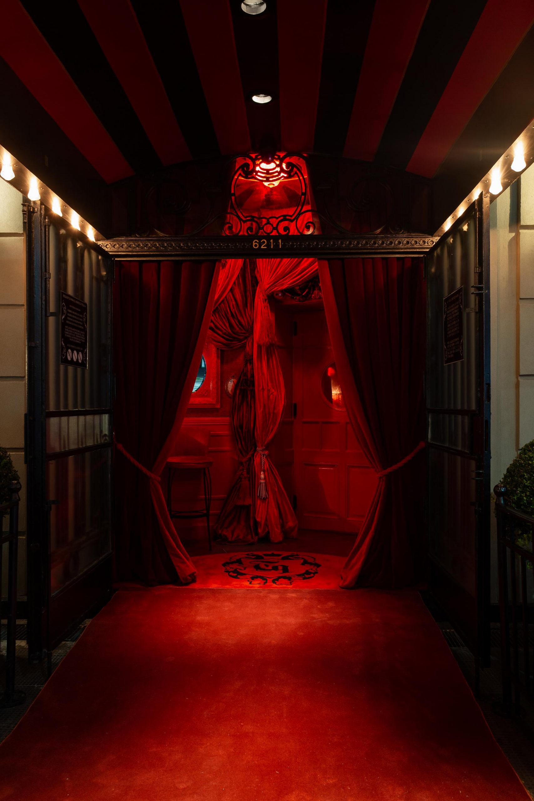 Al atravesar el hall de entrada, pasamos por unos cortinados de terciopelo rojo con infinidad de strasses cosidos a mano, para que por medio de la luz se produzcan brillos, un efecto lumínico.