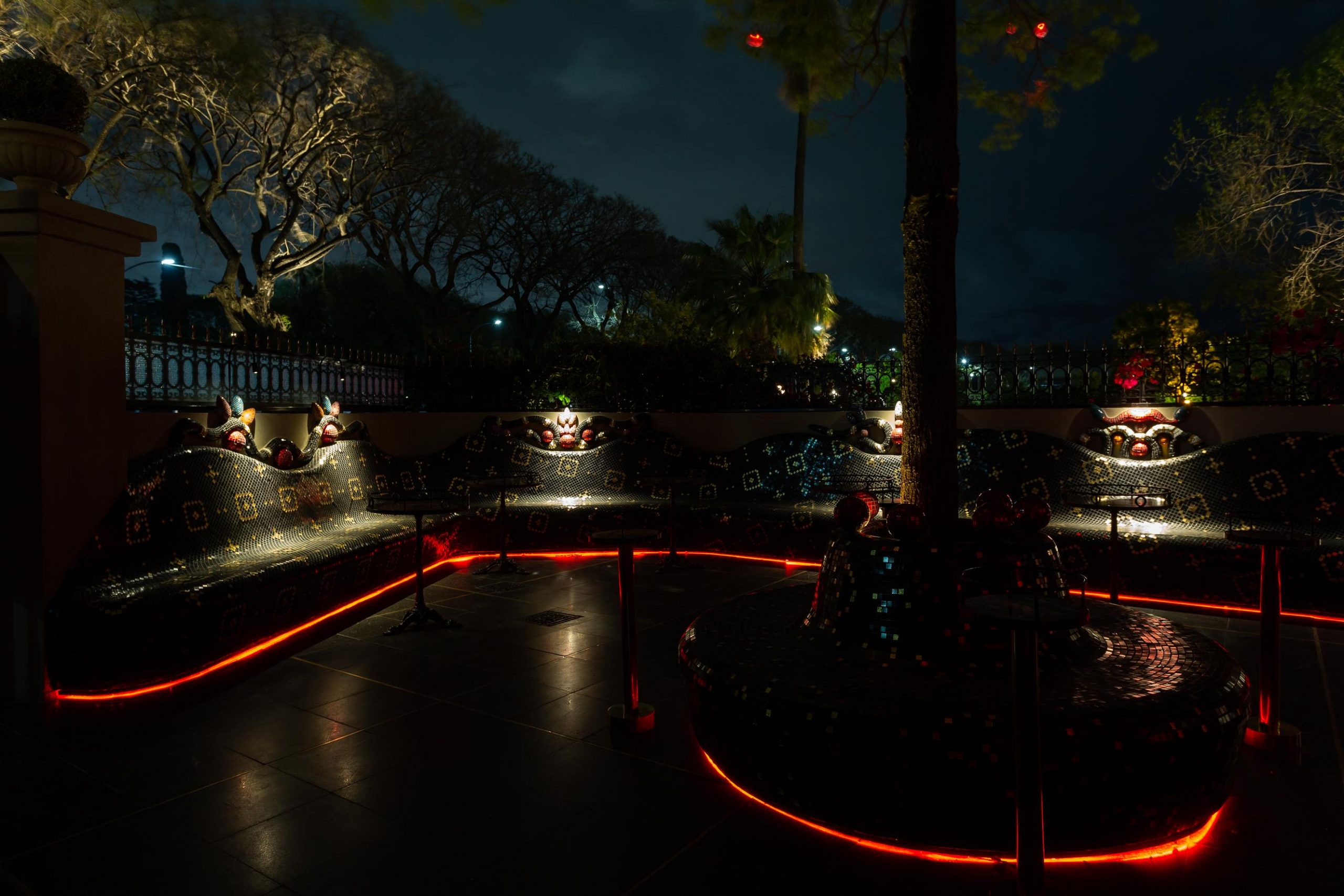 El Patio surge inspirado en El jardín del Eden por Isabel Garcia Calvo y un gran equipo que logró materializarlo como lo pensó. Tiene una morfología que continúa la saga de las víboras que recorre todo el lugar. Un millón de venecitas forman este gran banco que recorre el perímetro del patio con 7 esculturas en su respaldo iluminadas para destacarlas en la noche. El árbol del centro de este Eden lo envuelve otro banco con las mismas características con 7 esferas realizadas con venecitas rojas que representan 7 manzanas de los 7 pecados capitales. Un detalle gracioso son las 3 estrellas de bronce en el piso, que te reciben, ni bien ingresas al patio. Para algunos representan los 30 años de tequila y para otros las 3 estrellas de la camiseta argentina. El lugar está lleno de mensajes y detalles que solo algunos van descifrando.