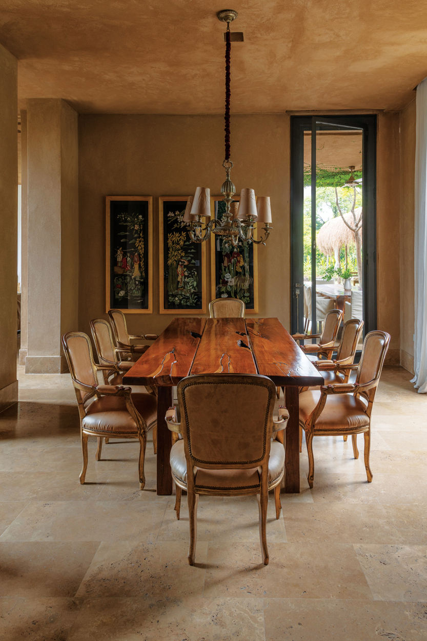 Espejo con marco dorado y una antigua mesa de planchar: piezas principales de este rincón que concentra objetos atesorados. Izquierda: la mesa de comedor, diseñada por López Zavalía, compuesta por tres tablas de lapacho, acompañada por sillas antiguas. En el fondo, un tríptico con figuras orientales tejidas por la dueña de casa.