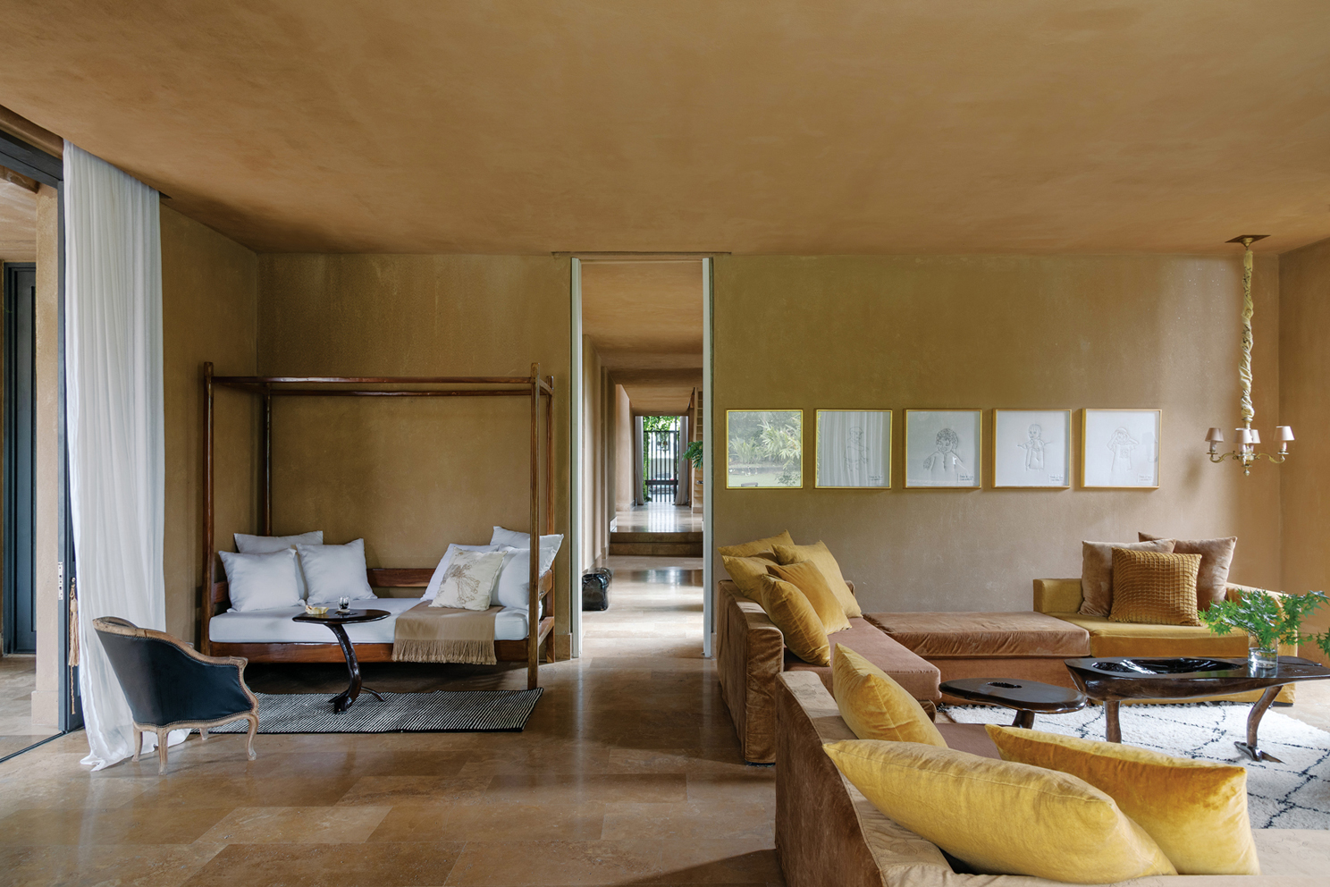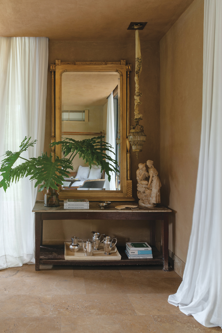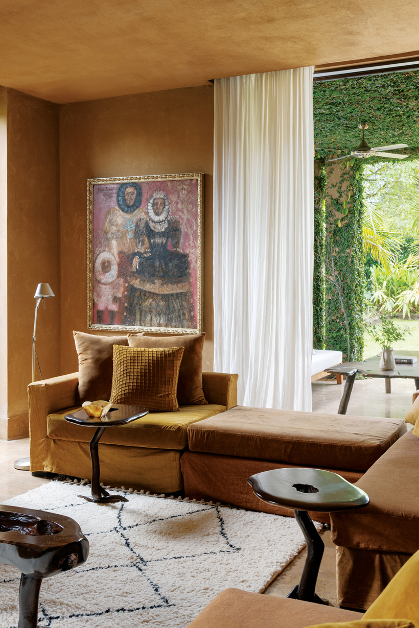 La obra “Familia Virreinal”, del artista Ezequiel Linares, sobre la pared que esconde por completo las aberturas que dan hacia la galería. Cortinas de lino camisero. “La vivienda habla por sí misma, solo había que acompañar la arquitectura”, describe Popi que organizó la ambientación con una combinación de creaciones propias, textiles artesanales, piezas heredadas y antigüedades.