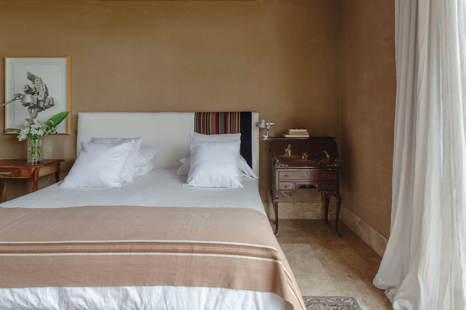 Fiel a su amor por lo artesanal, la mesa redonda con tapa de cuero, una de las mesas de luz, la cómoda con tiradores de asta y los sillones son creaciones de López de Zavalía. En el respaldo de la cama, un poncho (Salvatierra); a los pies, una manta que proviene del pueblo salteño de Seclantás. Alfombra de Akrópolis Antigüedades. Sobre uno de los sillones antiguos, un poncho de vicuña heredado.