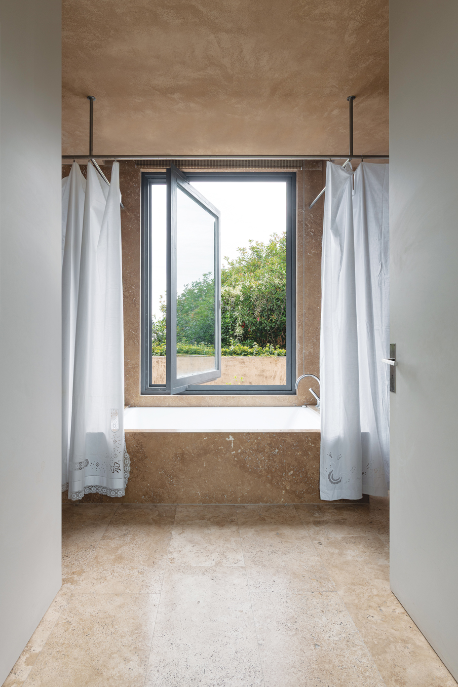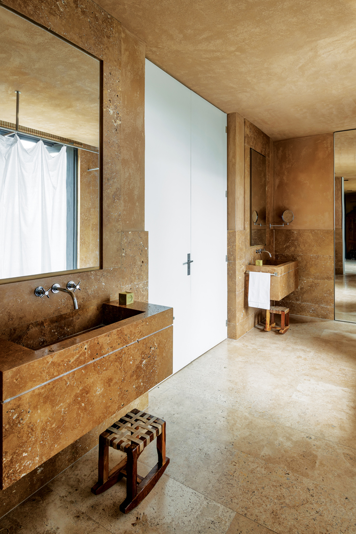 “Pablo sugería que había que darles más metros a los cuartos de los adultos que a los de los hijos, que se van pronto de la casa”, cuenta sobre el consejo del arquitecto. Por eso, en la planta alta, la master suite tiene dimensiones más generosas e incluye un baño. Aquí, la puerta de doble hoja separa el sector de las bachas, hechas con bloques suspendidos, del área de la bañedera. Jabones La Tienda. Cortina hecha con sábanas antiguas.
