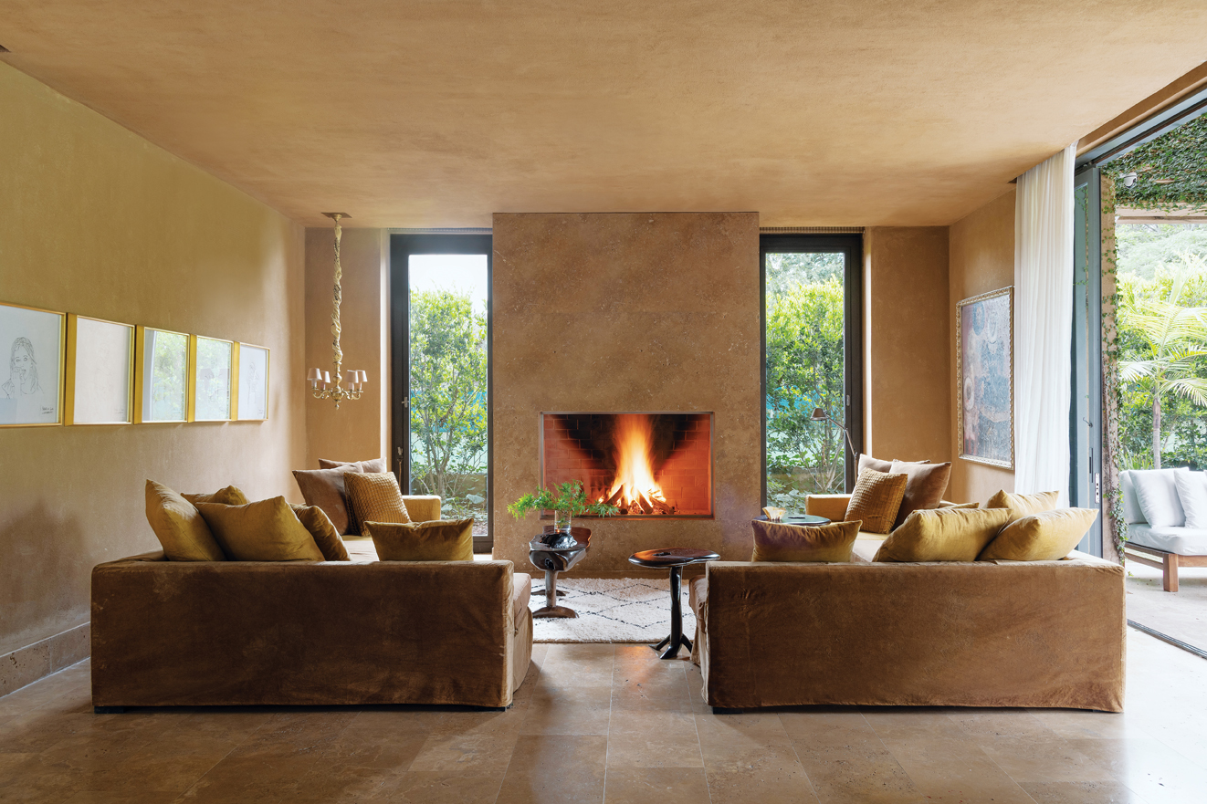 El living se organizó en torno al hogar con sillones modulares. Fundas de géneros teñidos y almohadones de terciopelo, lino y panamá (Ana Fuchs). Las mesas de arrime de lapacho tucumano son de la serie Reciprocidad (Popi López de Zavalía). Las formas naturales, casi sin intervención, expresan la búsqueda artística de la diseñadora. Alfombra estilo bereber traída de España.