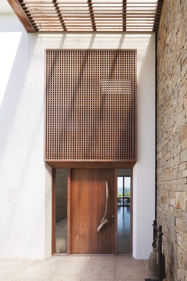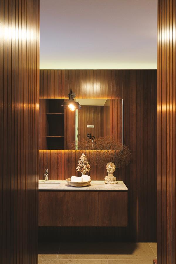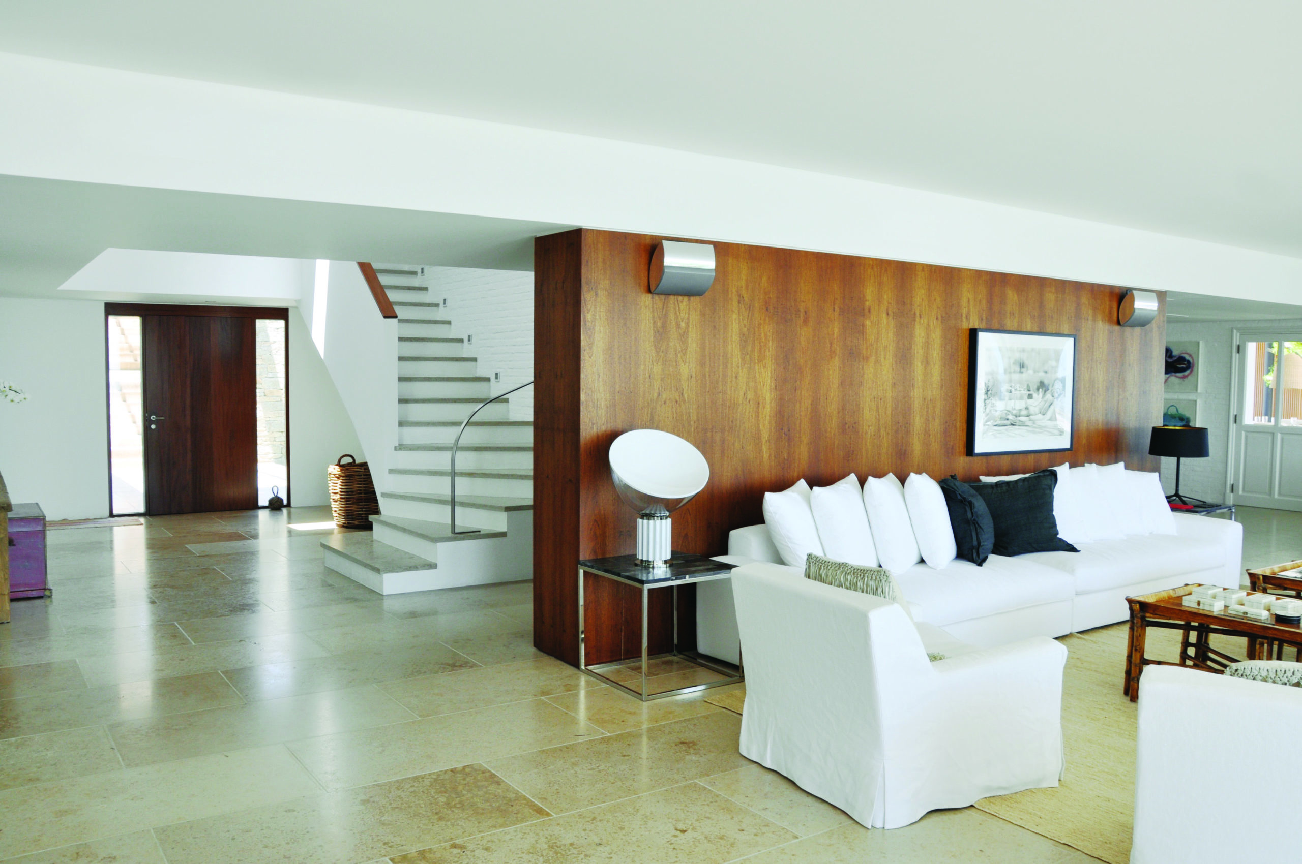 La casa original fue construida en la década de los noventa cuando José Ignacio mutaba de pueblo de pescadores a balneario exclusivo de 25 manzanas. Con ese punto de partida, buscaron abrir la vivienda hacia ese entorno natural privilegiado, “extendiendo especialmente el nivel de la planta baja en un gran semicubierto complementado por un nuevo pabellón, con excepcionales vistas al atardecer y al puerto de pescadores”. El objetivo nunca fue descartar, sino capitalizar: “La construcción existente de muros de ladrillo con techos de teja colonial conformaba un volumen tradicional, circundado por algunas galerías perimetrales. La renovación interviene esa propuesta con un ensamble de nuevas tecnologías: estructuras de hormigón, muros de piedra, pérgolas y revestimientos en madera de lapacho.