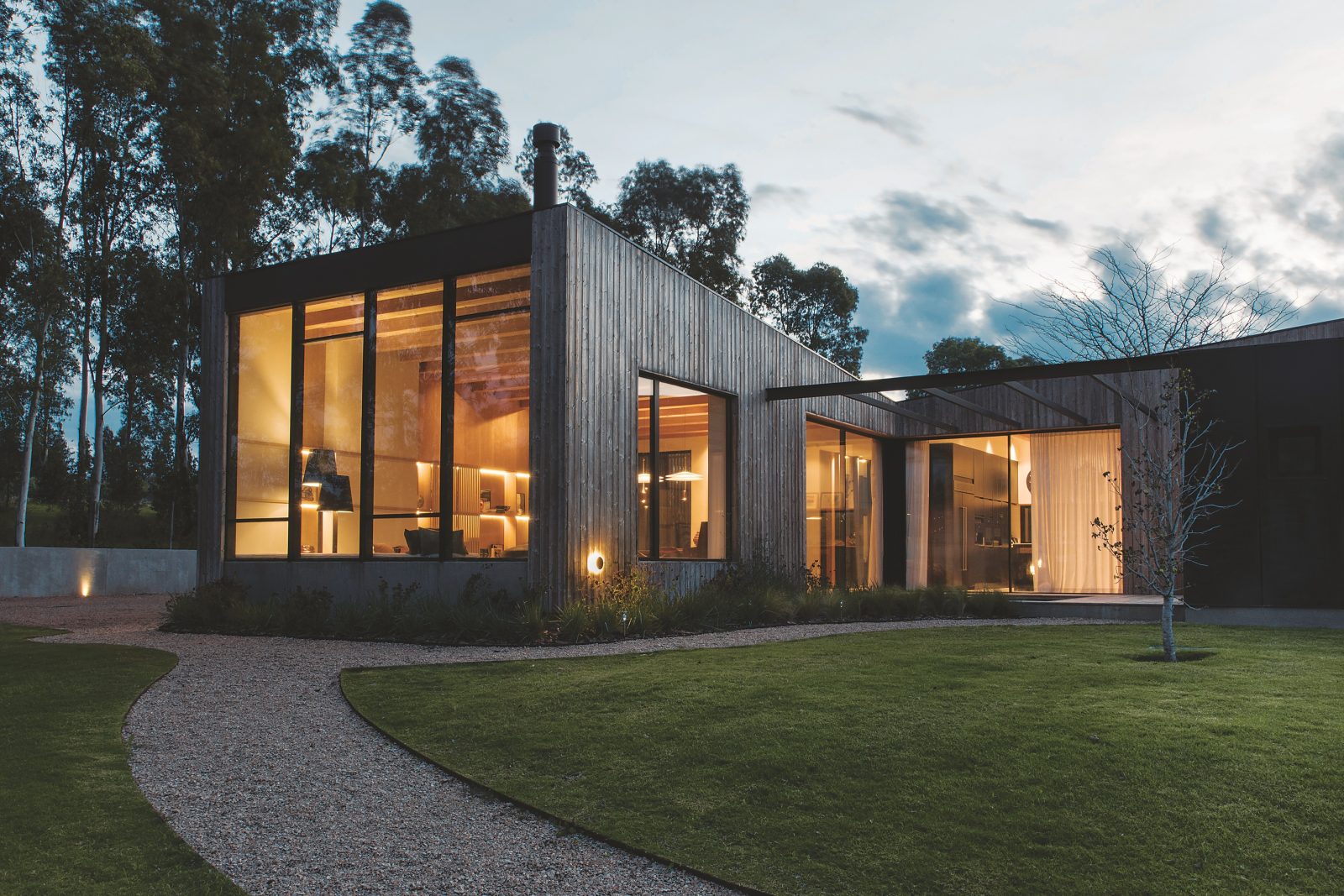 En un barrio cerrado en los alrededores de Montevideo, entre lomas y árboles centenarios, se destaca una vivienda. Su creador, el arquitecto argentino Juan Carosi, la describe así: “Una casa contemporánea en su concepción, con dos inspiraciones muy marcadas. En su espacialidad y relación con el entorno, alude a la arquitectura californiana de los años cincuenta, a las Case Study Houses: una sola planta que se extiende en todas las direcciones del terreno, apropiándose de él y sus desniveles. Así surgen los patios y exteriores, que forman parte de la residencia tanto como los interiores, en una fusión del paisajismo con la arquitectura. La otra influencia, visible en la materialidad y la volumetría, remite al estilo escandinavo, con la madera como protagonista exclusiva, los postigos que se intercalan entre vacíos y llenos, y los techos inclinados a una sola agua en distintas direcciones y alturas”.
