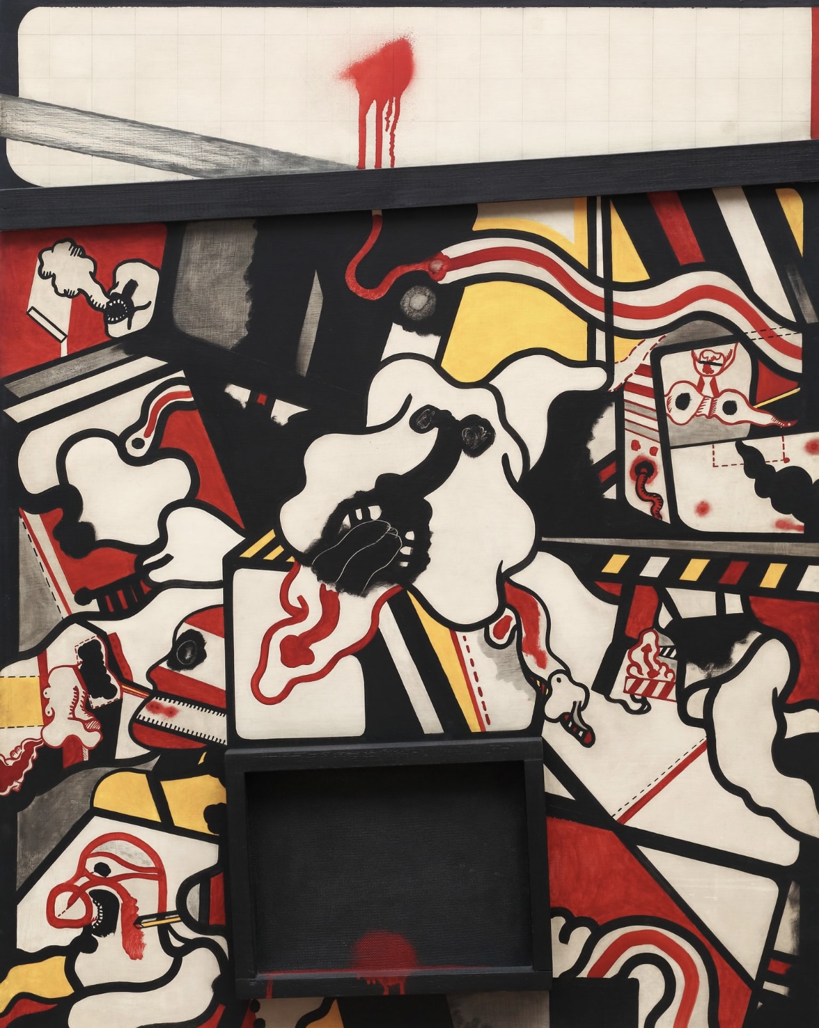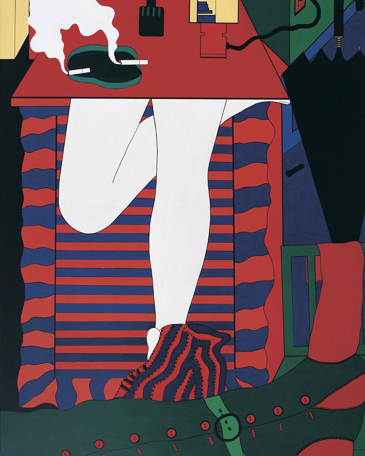 Unas piernas femeninas, desnudas y cruzadas, ocupan el centro de Série Envolvimento (Wanda Pimentel, 1968). Una mesa las cubre como una falda, sobre la que se apoya un cenicero. Ropas y objetos cotidianos construyen un espacio fragmentado: el de la representación pictórica y, a la vez, el de una casa urbana. El cuerpo aparece recortado, como en un plano cinematográfico que decide dejarlo fuera de campo. La obra, parte de la colección MALBA, es la imagen icónica de Pop Brasil, la muestra organizada por la Pinacoteca de San Pablo.