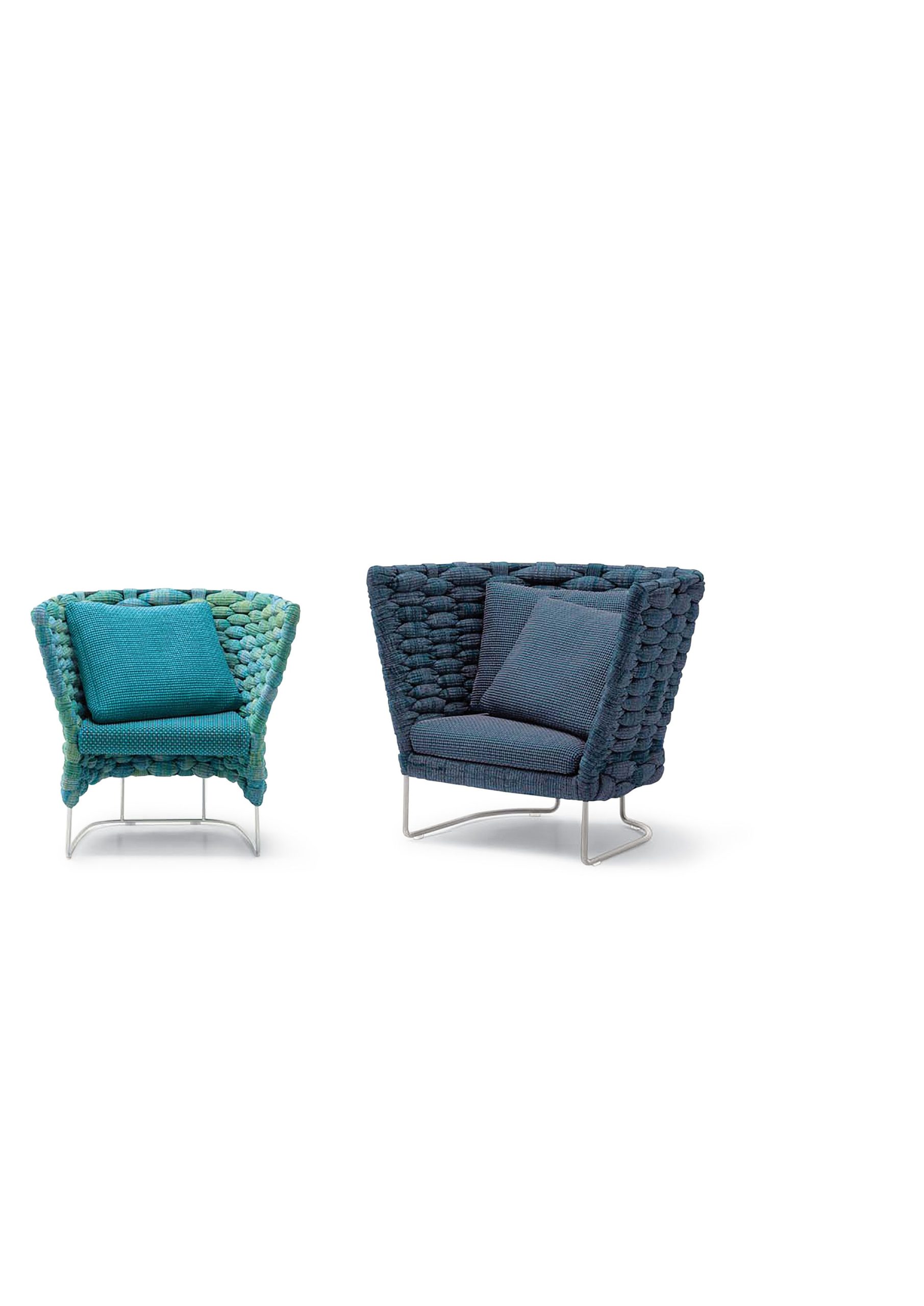 2. Silla de la serie Ami, con estructura de acero inoxidable y respaldo tejido a mano directamente sobre la estructura. La tapicería es de fibras sintéticas high tech, resistente al agua y rayos UV.