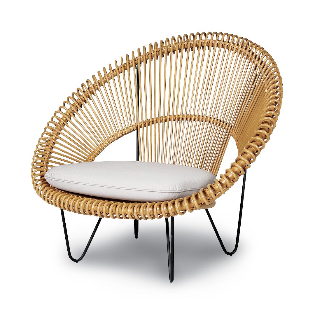 2. Sillón de living con estructura en caña malaca y asiento con almohadón en tela, origen Bélgica (93 x 105 x 86).