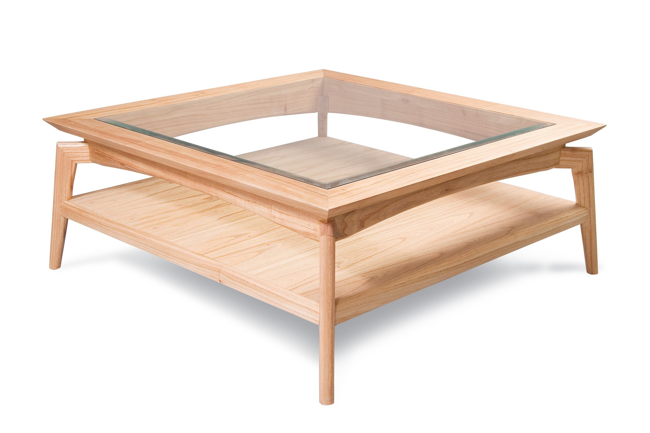 Mesa Vuelo realizada en madera paraíso con tratamiento poliuretánico y cristal biselado de 6 mm (100 / 100 cm).