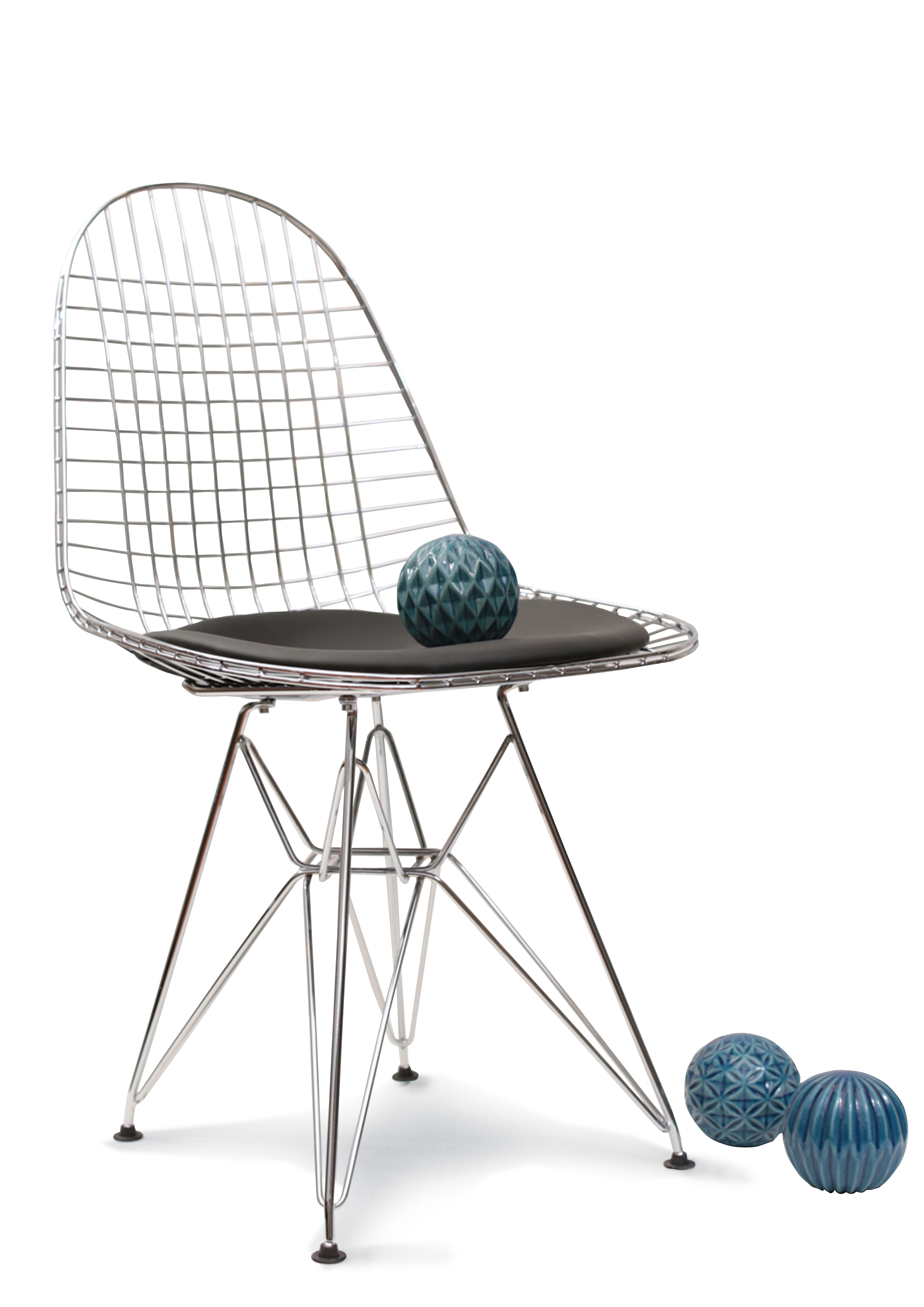 Silla Eames Wire, base cromada de acero tubular, almohadó de cuero negro. Producto importado (46 x h82 x p40 cm).