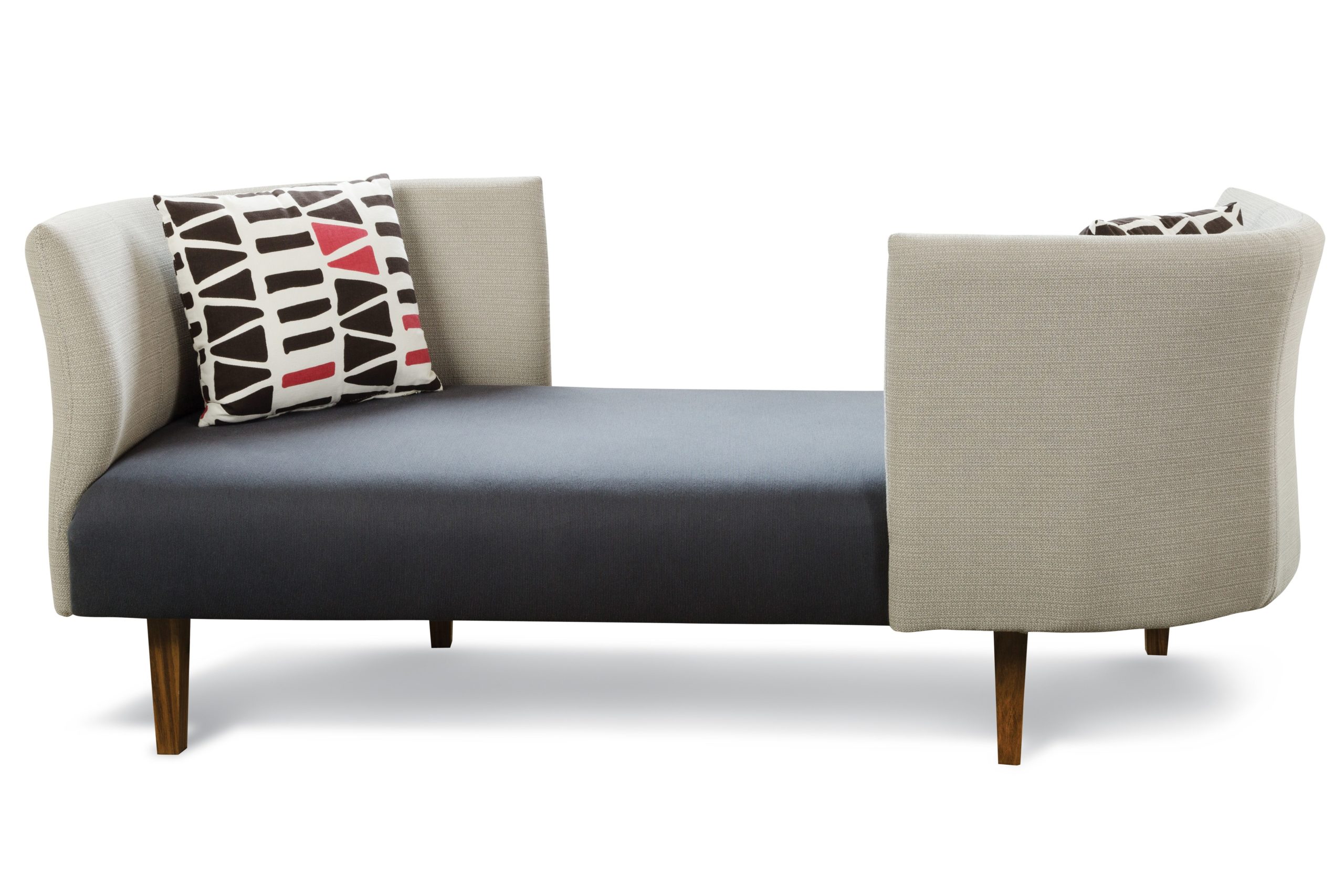 Sofá Daybed Nelson, estructura de acero cromado y madera natural lustrada, asiento tapizado a elección (190 cm x 85 cm x h72 cm).