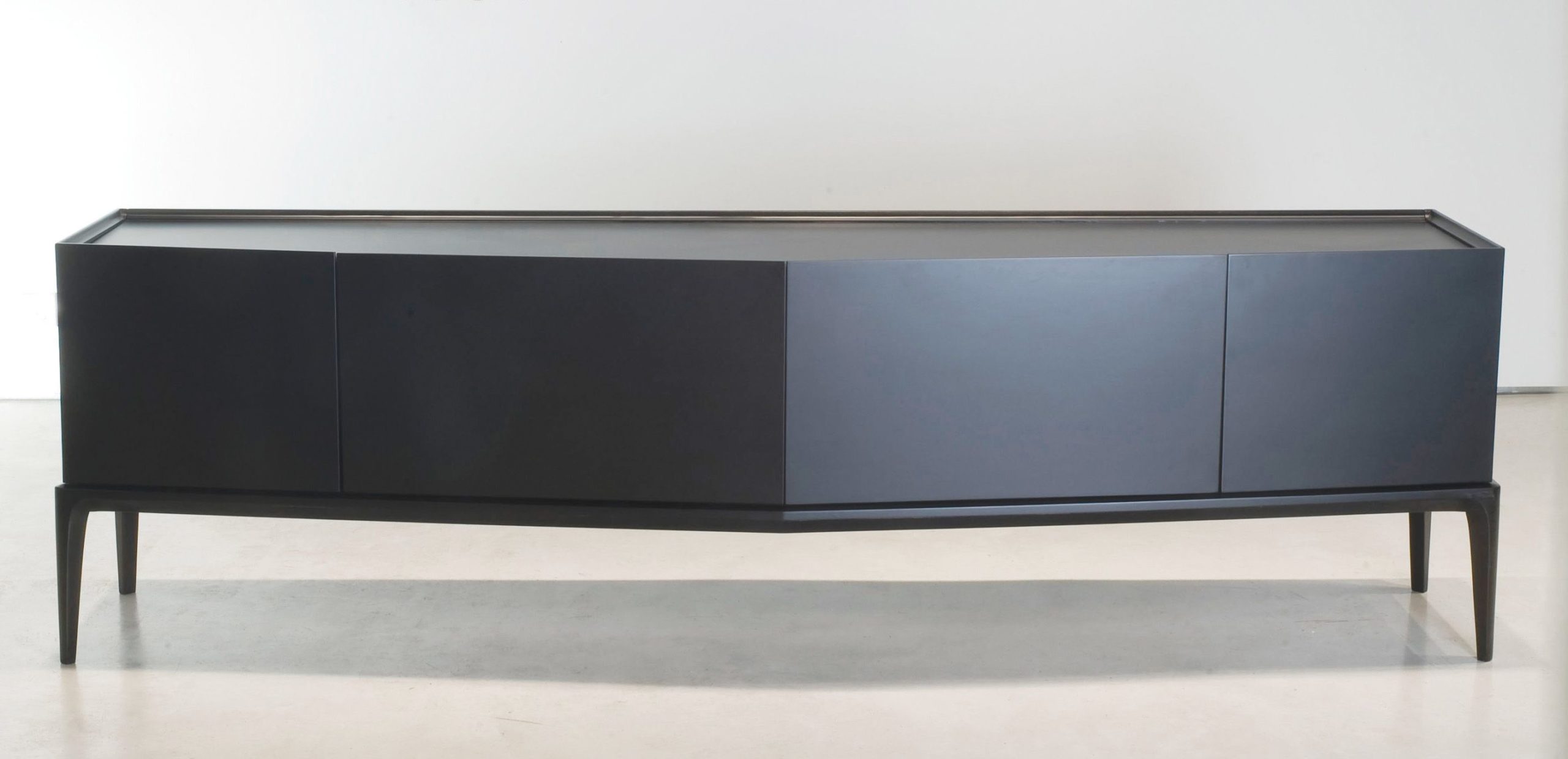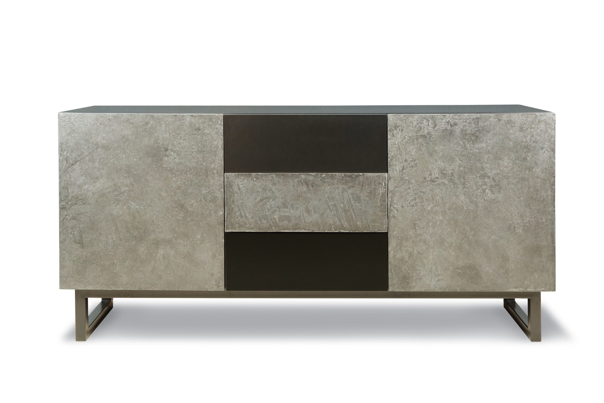 Vajillero África, en madera laqueada combinada con patina de cemento color negro pizarra. Base metálica en negro semimate (1.80 x 0,50 x 0,86h). Colección Black is Black 2018