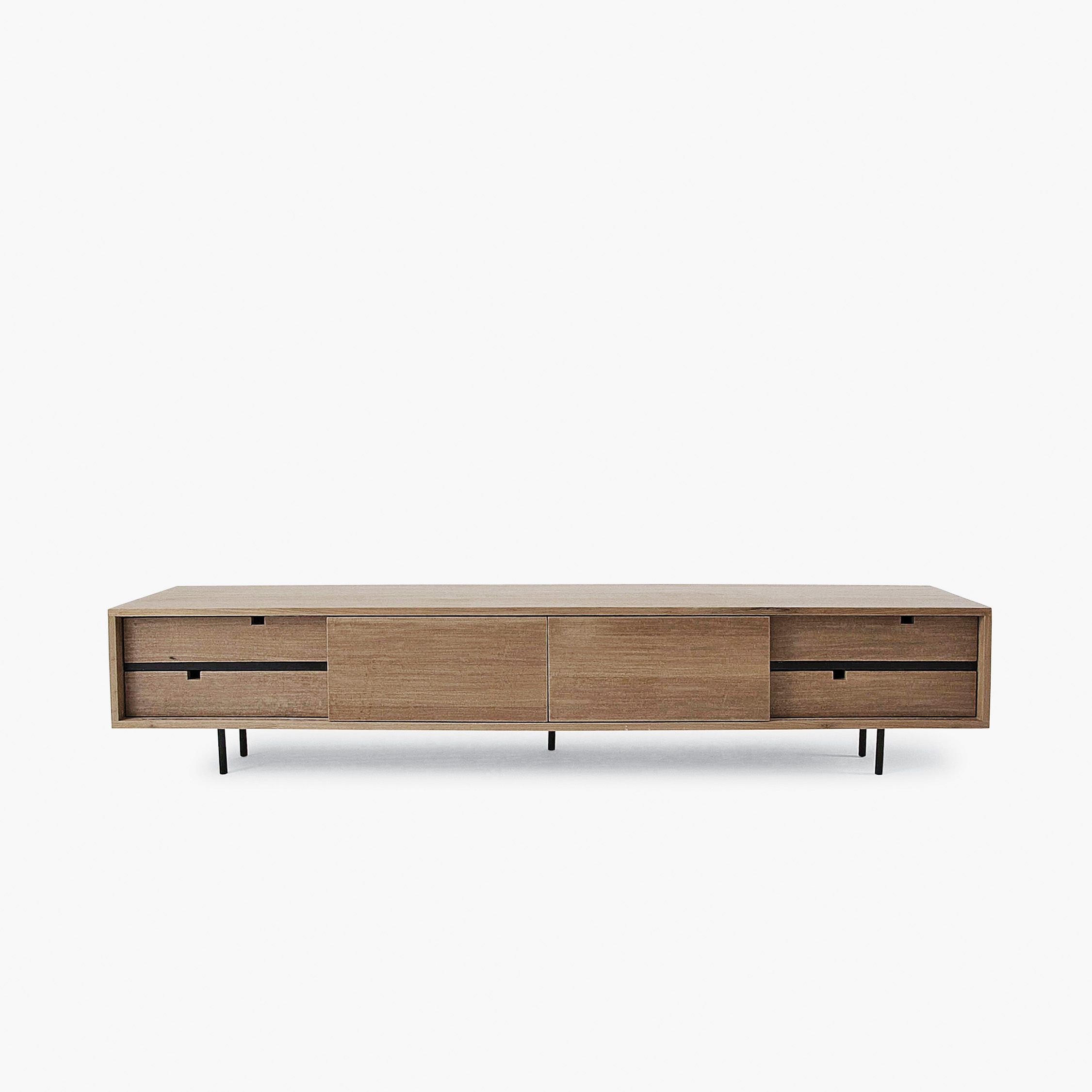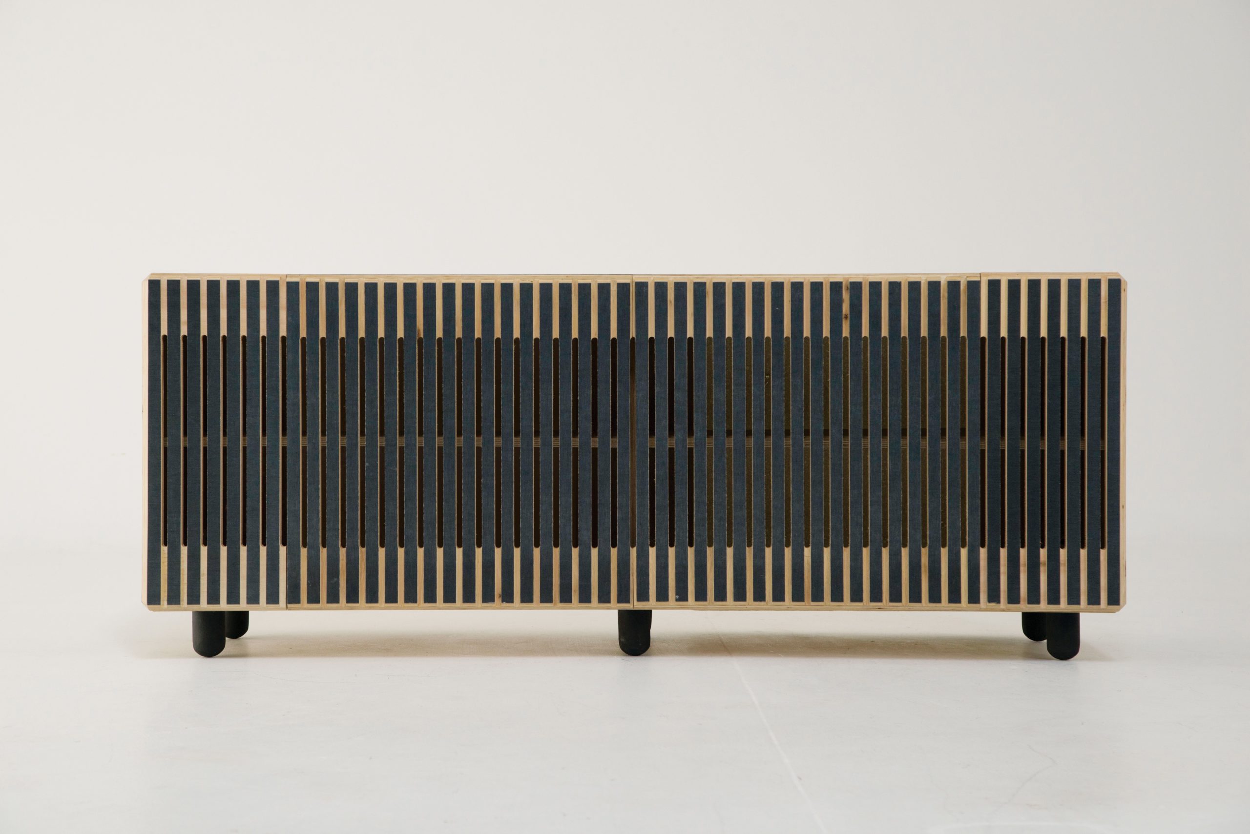 Cómoda, mueble de guardado realizado en compuesto de maderas reconstituidas con terminación de diferentes colores, sistema push para apertura de puertas. El trabajo de rejas sobre el frente del mueble permite colorar aparatos electrónicos en su interior, y utilizar los controles remotos de los equipos (150 x 40 x H 60 cm).