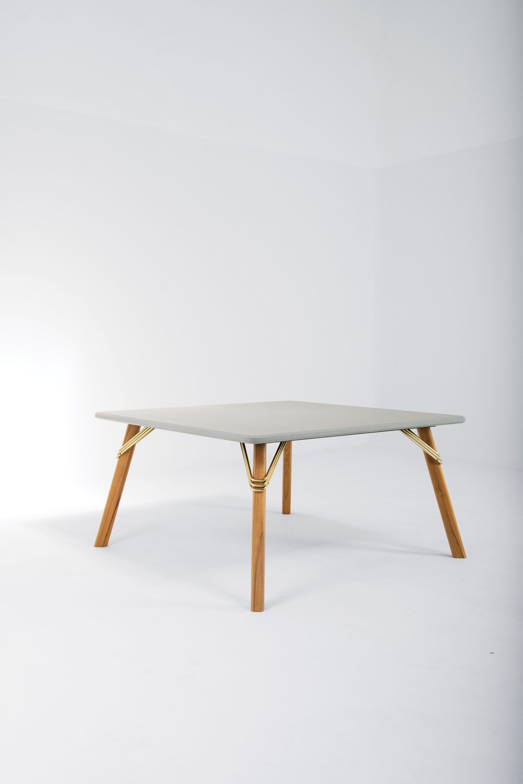 Mesa con tapa de compuesto mineral, patas de álamo e incienso con anclaje a la mesa de triángulos y terminaciones metálicas (140 x 140 x h 73 cm).