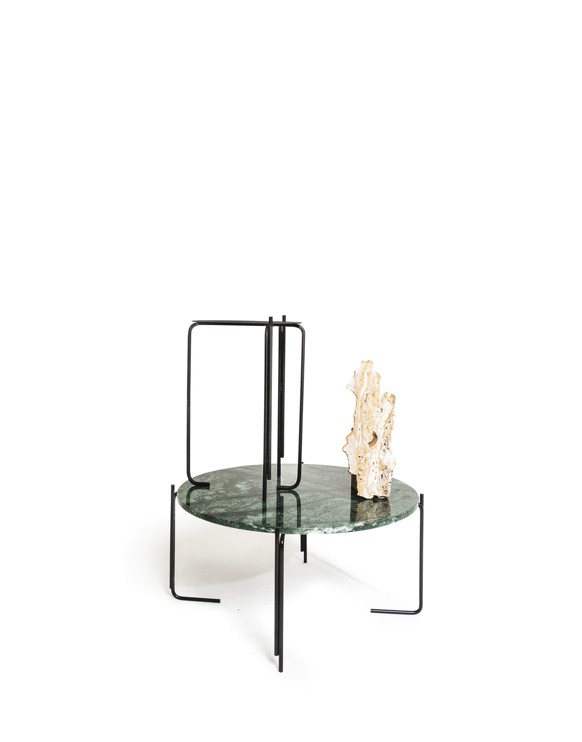 Mesas bajas India, combinadas con el tradicional mármol verde sobre una base de hierro curvado.