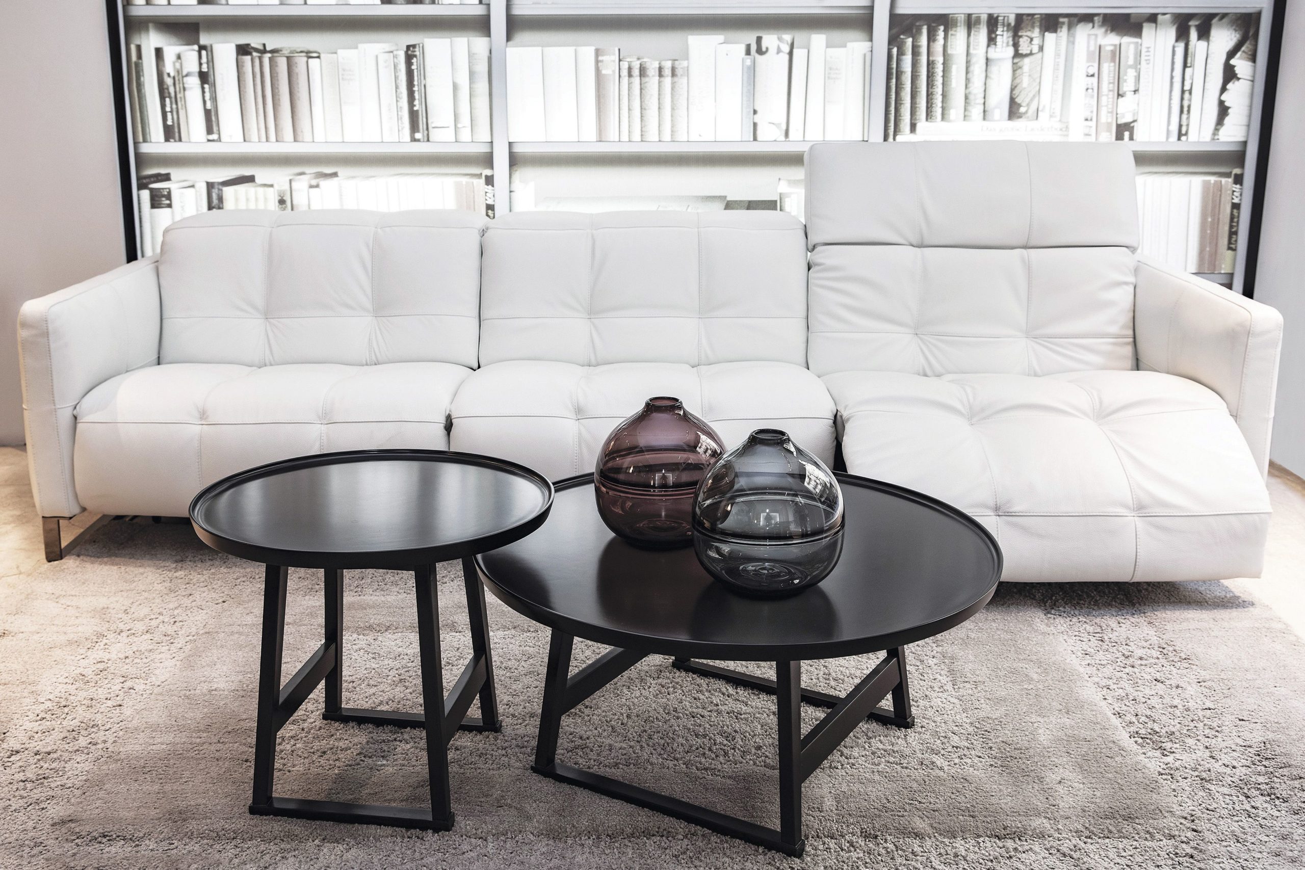 Sofá Natuzzi modelo Raúl tapizado en cuero con mecanismo eléctrico independiente en cada módulo en acero. Mesas Rezip laqueadas