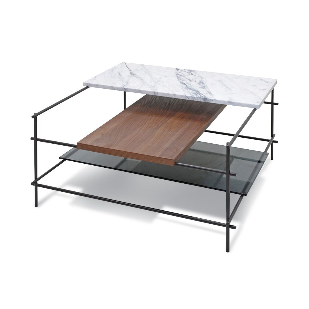 1. Mesa cuadrada de living con estante en vidrio color humo y tapa de mármol blanco y madera, origen Italia (40,5 x 80 x 80).