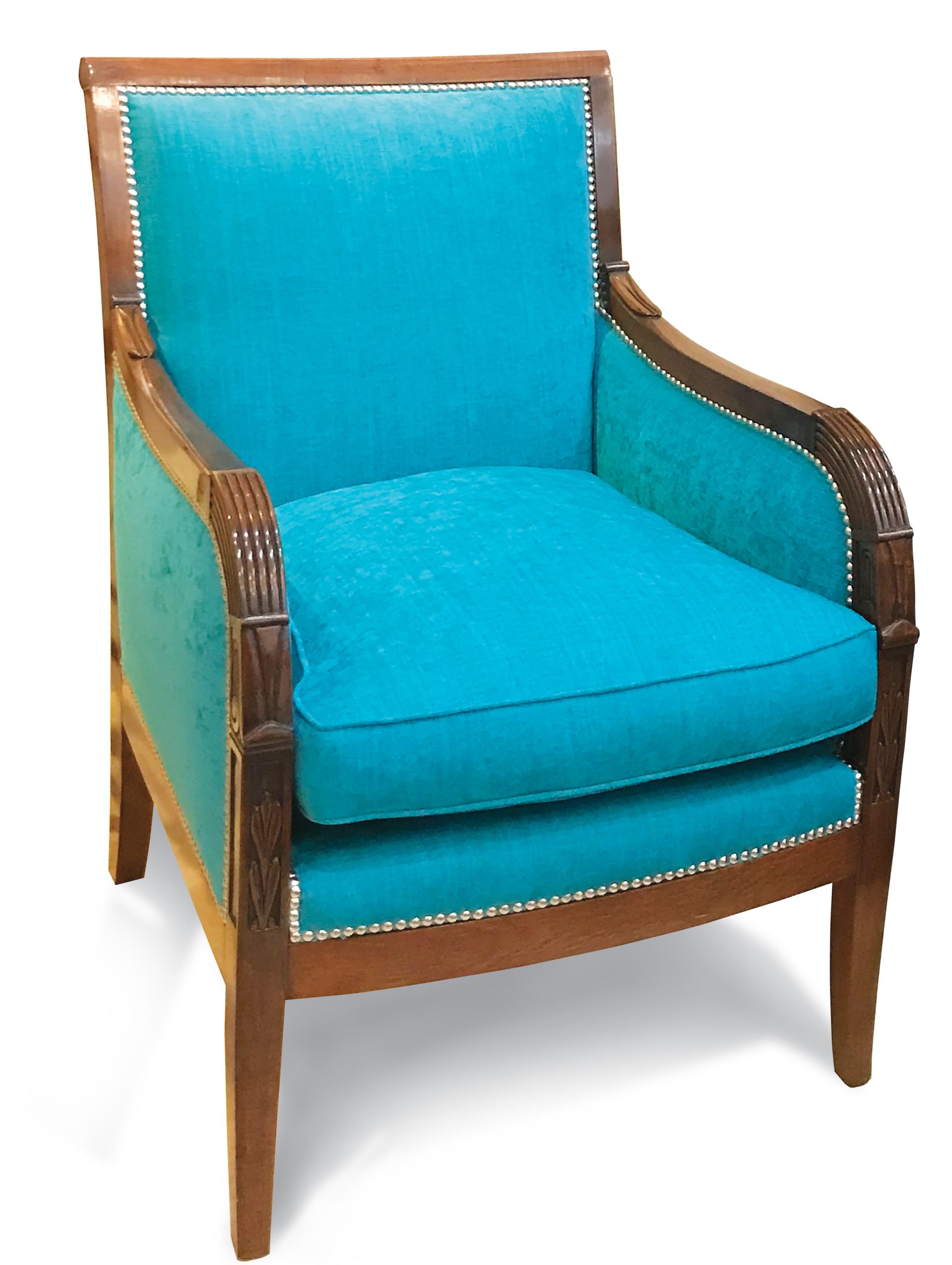 1. Sillón de líneas regency tapizado en chenille, asiento con resortes, interior con crin vegetal, almohadón relleno en silicona anti alérgica y terminación con tachas, lustre a mano en nogal mediano.