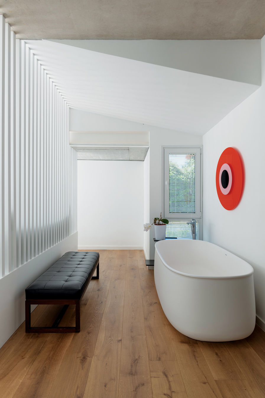 Dos elementos dominan el baño: la bañera Duravit y la grifería Metropol Hansgrohe (Bosh). Bachas Duravit, espejos redondos y mesada de Italmeco (Tilo, Montevideo). Lámpara de La Galerilla, Pueblo Garzón, y banqueta Aaron Hojman.