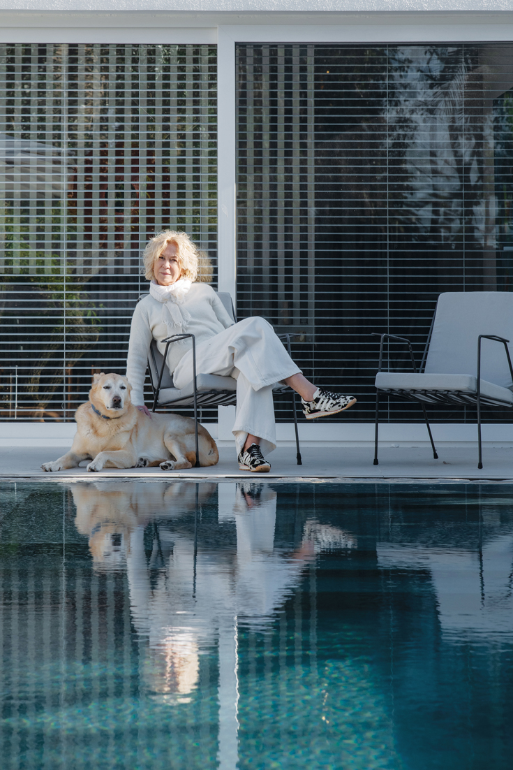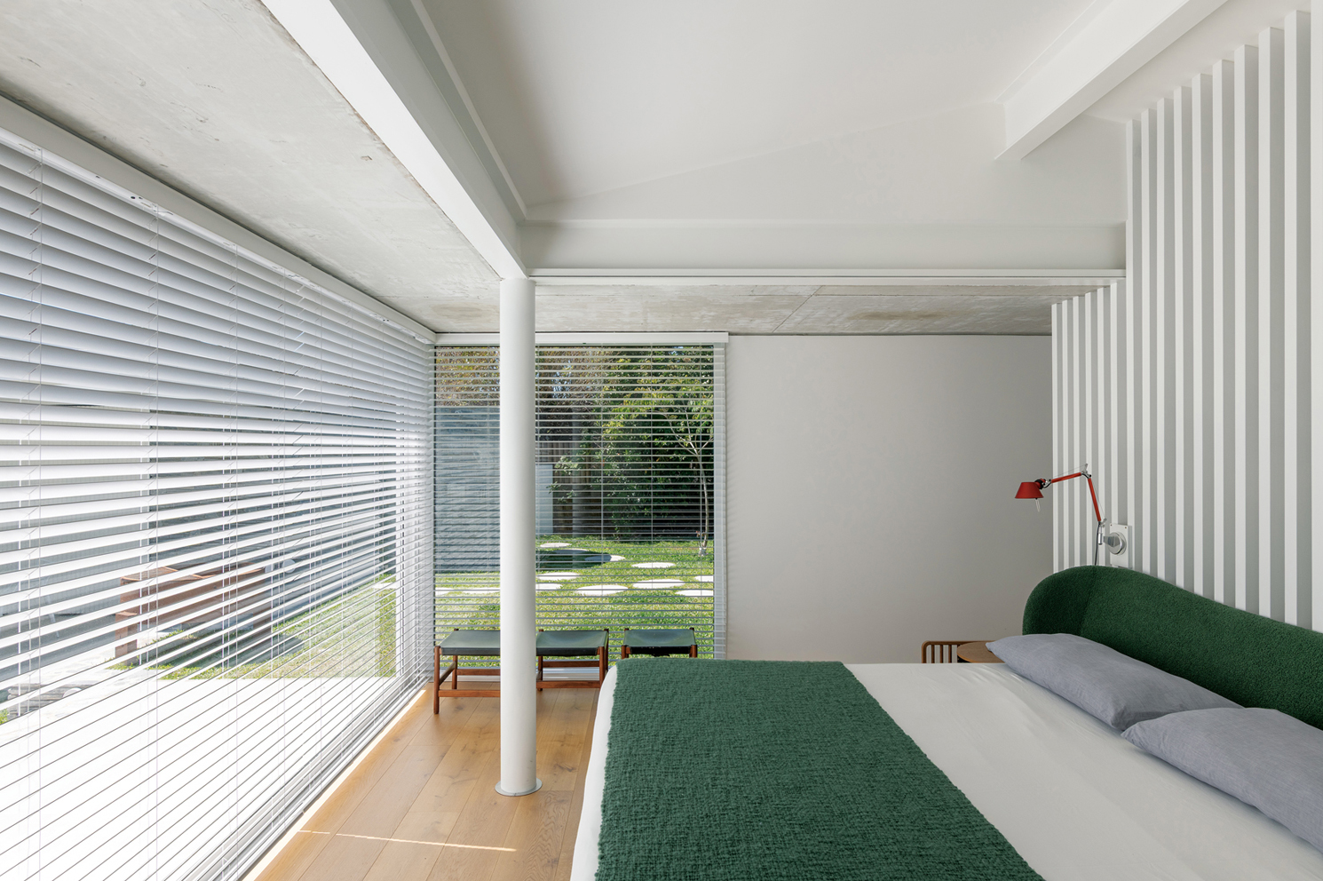 En este dormitorio, totalmente integrado al jardín, cama (Pianca), lámpara Tolomeo de brazo corto (Artemide), piso de madera FB Hout Holland (Tilo, Montevideo). La pileta flotante, inexistente en el chalet original, ahora se extiende sobre el jardín y une interior y exterior en una sinergia perfecta.