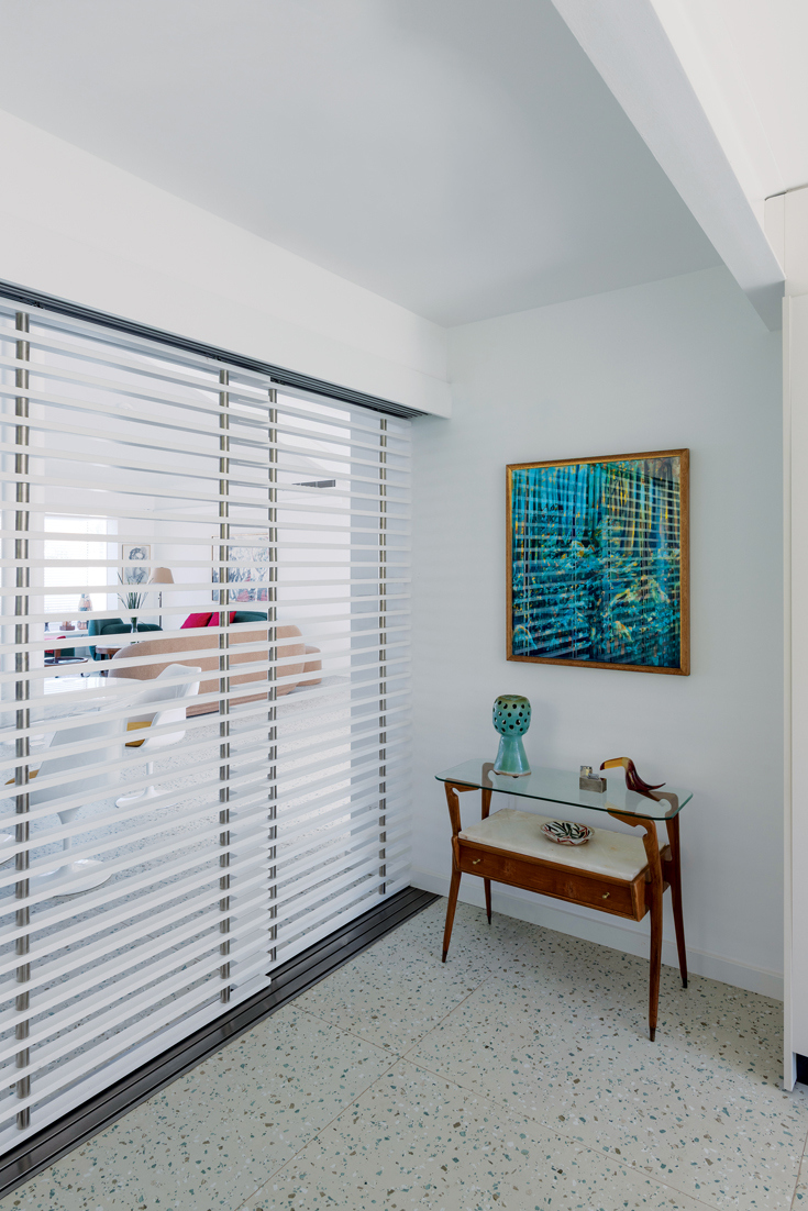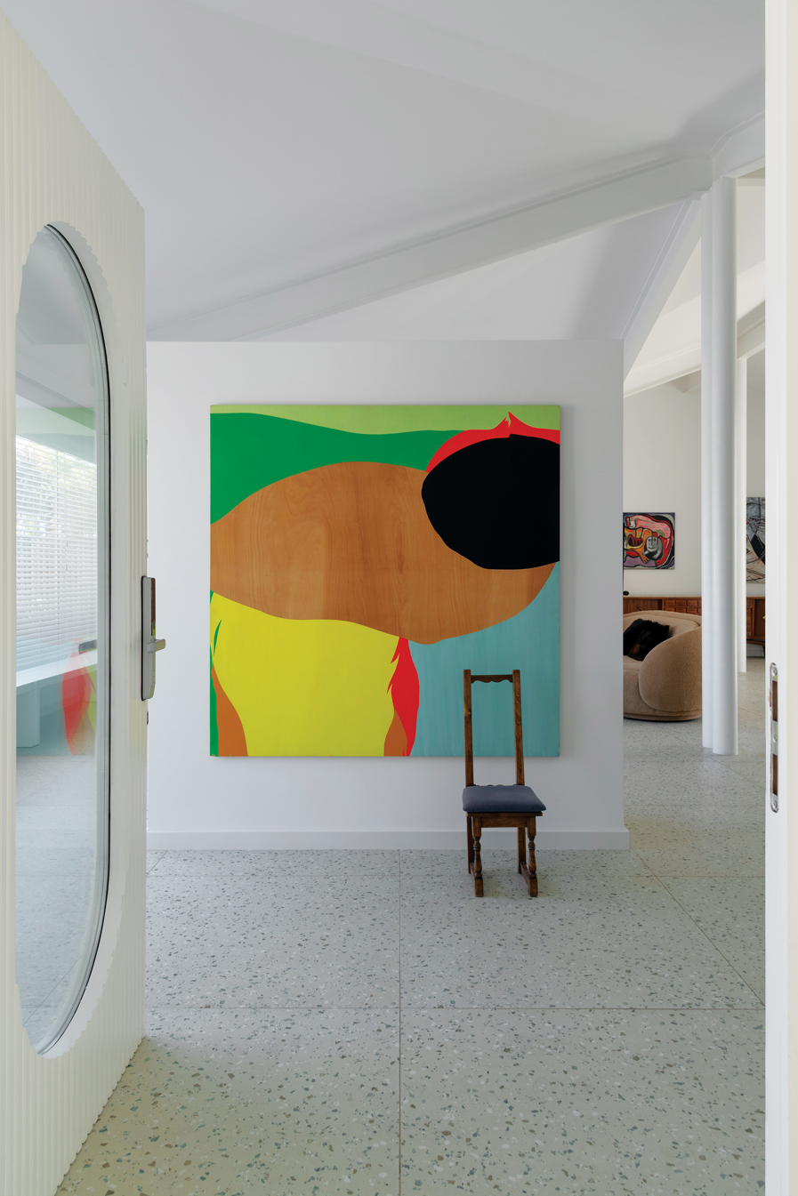 Una obra de tonos intensos del artista Ramiro Oller (Galería Jacques Martínez) preside la entrada al espacio principal y da la bienvenida a los visitantes. La pared —antes inexistente— organiza el área y, del otro lado, alberga la inmensa TV del living Bang & Olufsen.