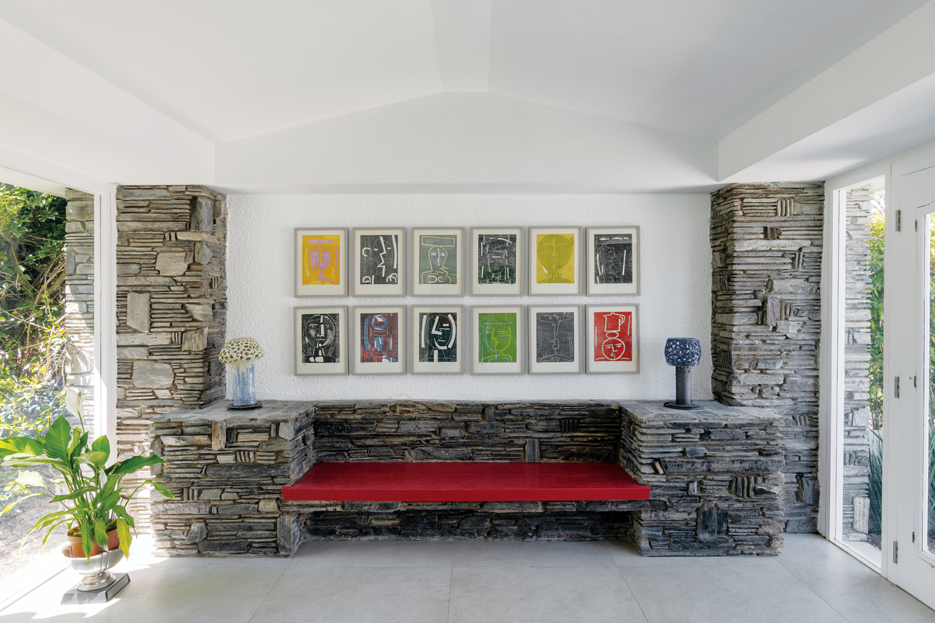 En el hall de entrada, doce cabezas del artista argentino-español Luis Seoane. Las lámparas de cerámica que enmarcan e iluminan las obras son creación de la dueña de casa. La piedra original del chalet se mantiene como protagonista del espacio.