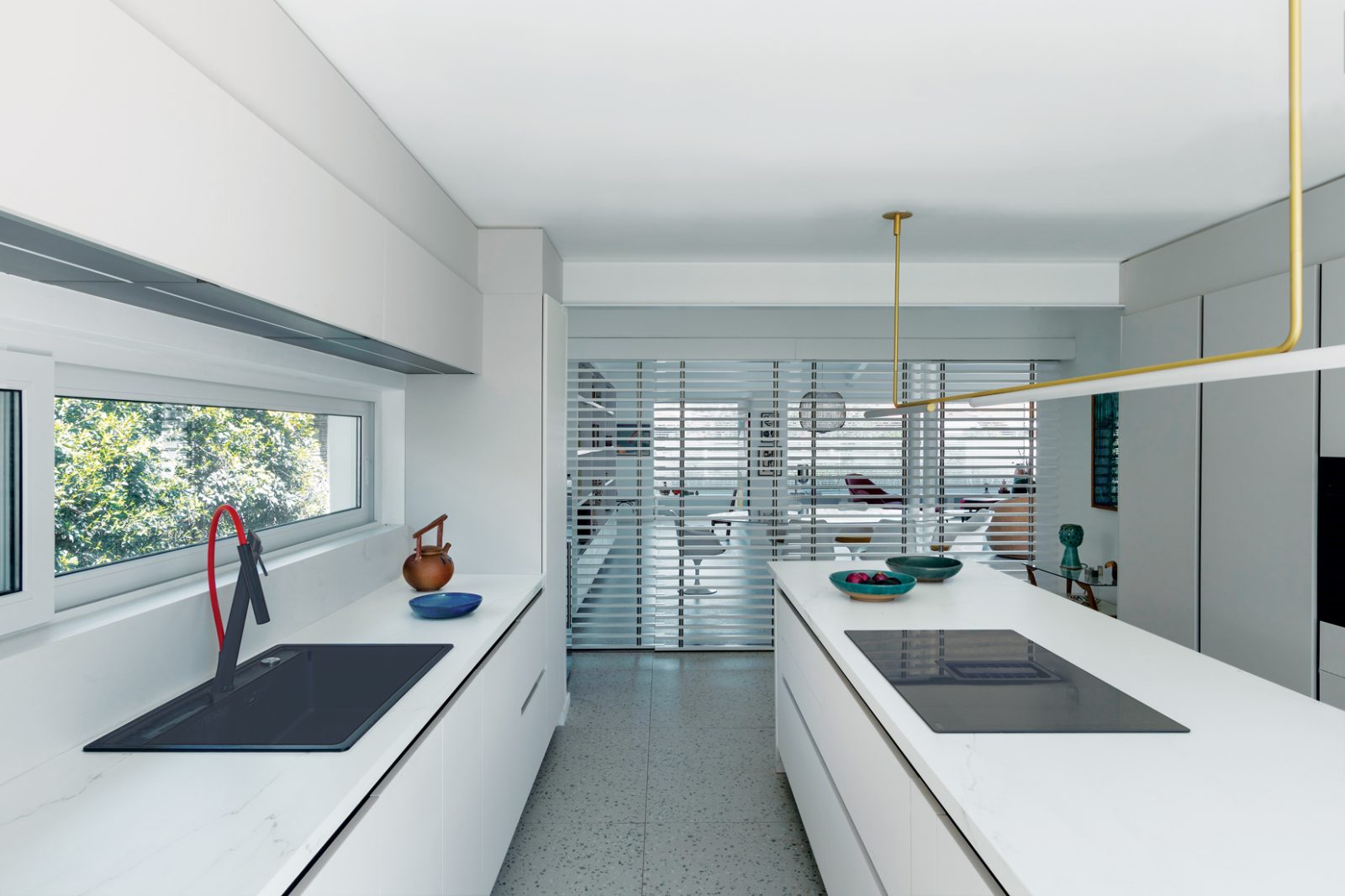 La cocina de estilo minimalista está separada del comedor, aunque ambos se espían sin invadirse a través de puertas corredizas horizontales (Veneta Cucine, Tilo, Montevideo). Electrodomésticos Franke y lámpara Ambrosía de Flos. En el espacio incorporado a la cocina, obra de Marina Fages (La Galerilla, Pueblo Garzón).