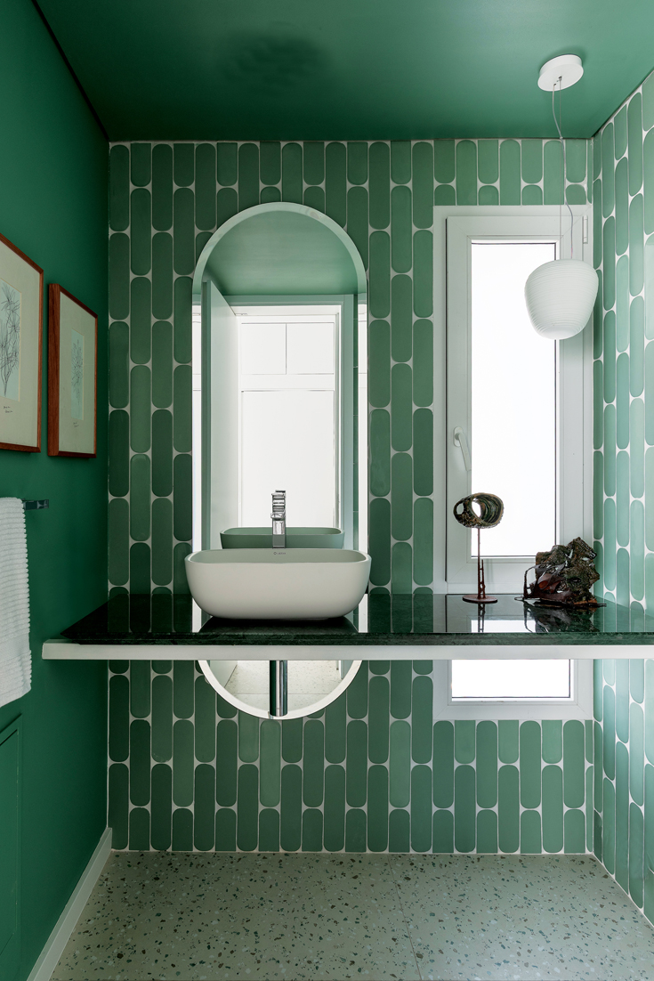 En el toilette, se retomaron los tonos originales del chalet. Los azulejos (Bosh) forman un dibujo y la lámpara Ritual de Foscarini (Trío Iluminación, Punta del Este) completa la escena. La mesada de cuarcita verde (Marmolería Abbate) aporta frescura y carácter.