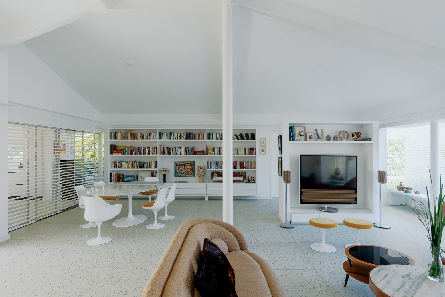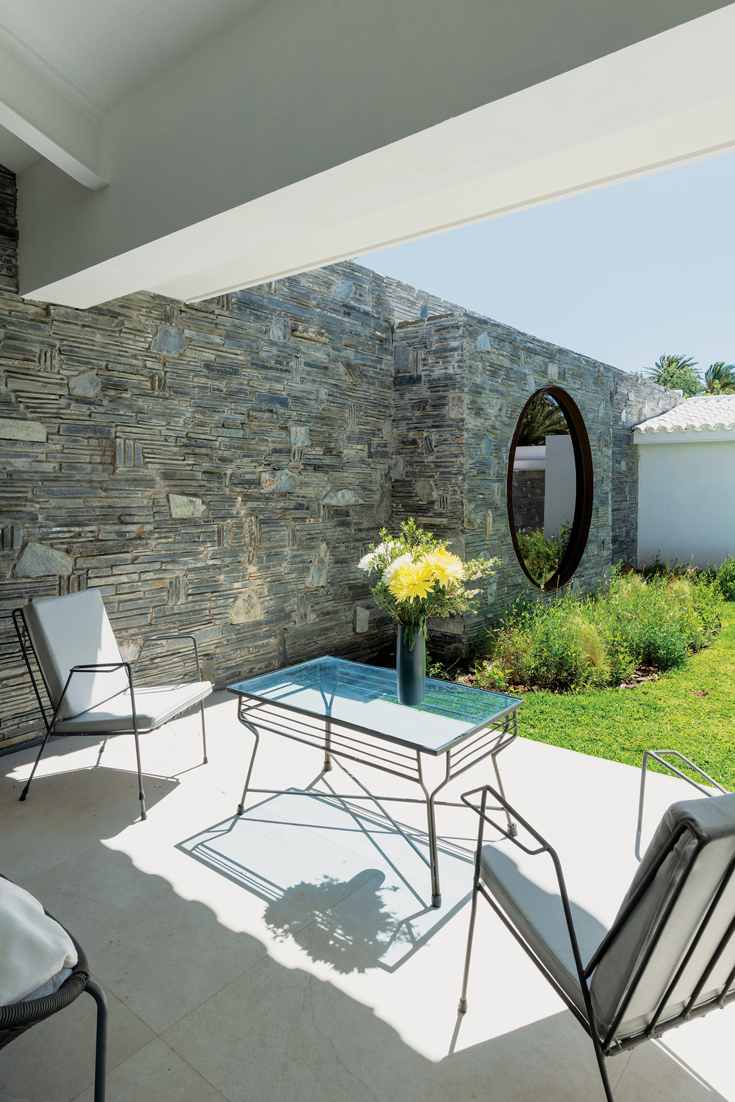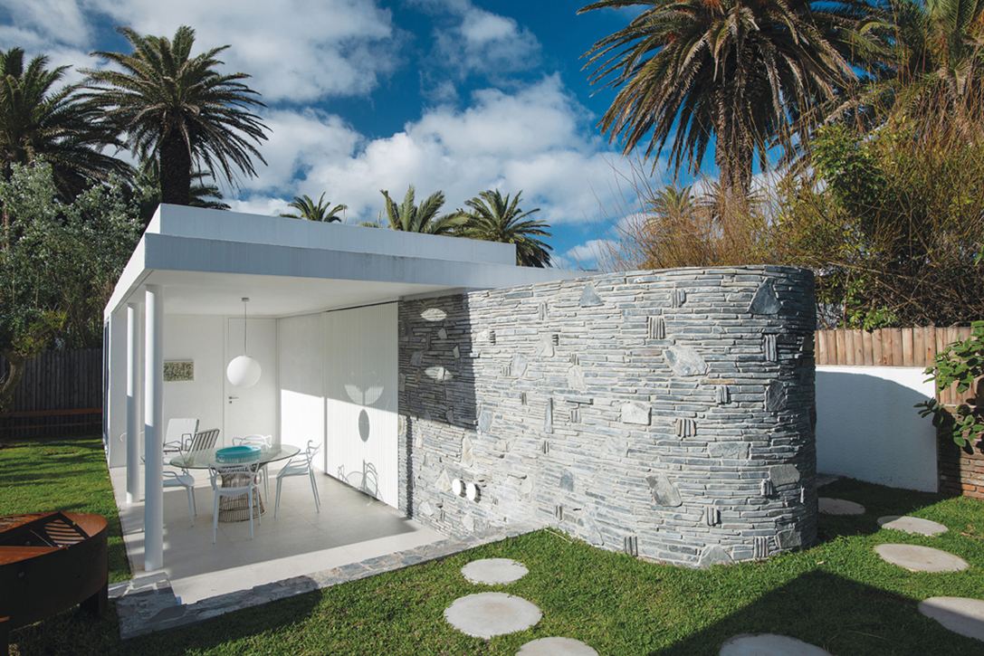 Esta área, independiente del resto de la casa, contiene el mini departamento de invitados. La mesa diseñada por Warren Platner en 1966 (Mad for Modern, La Barra, Punta del Este) dialoga con las sillas Toledo de Jorge Pensi. El volumen circular, que no existía en la construcción original, alberga la sala de máquinas.