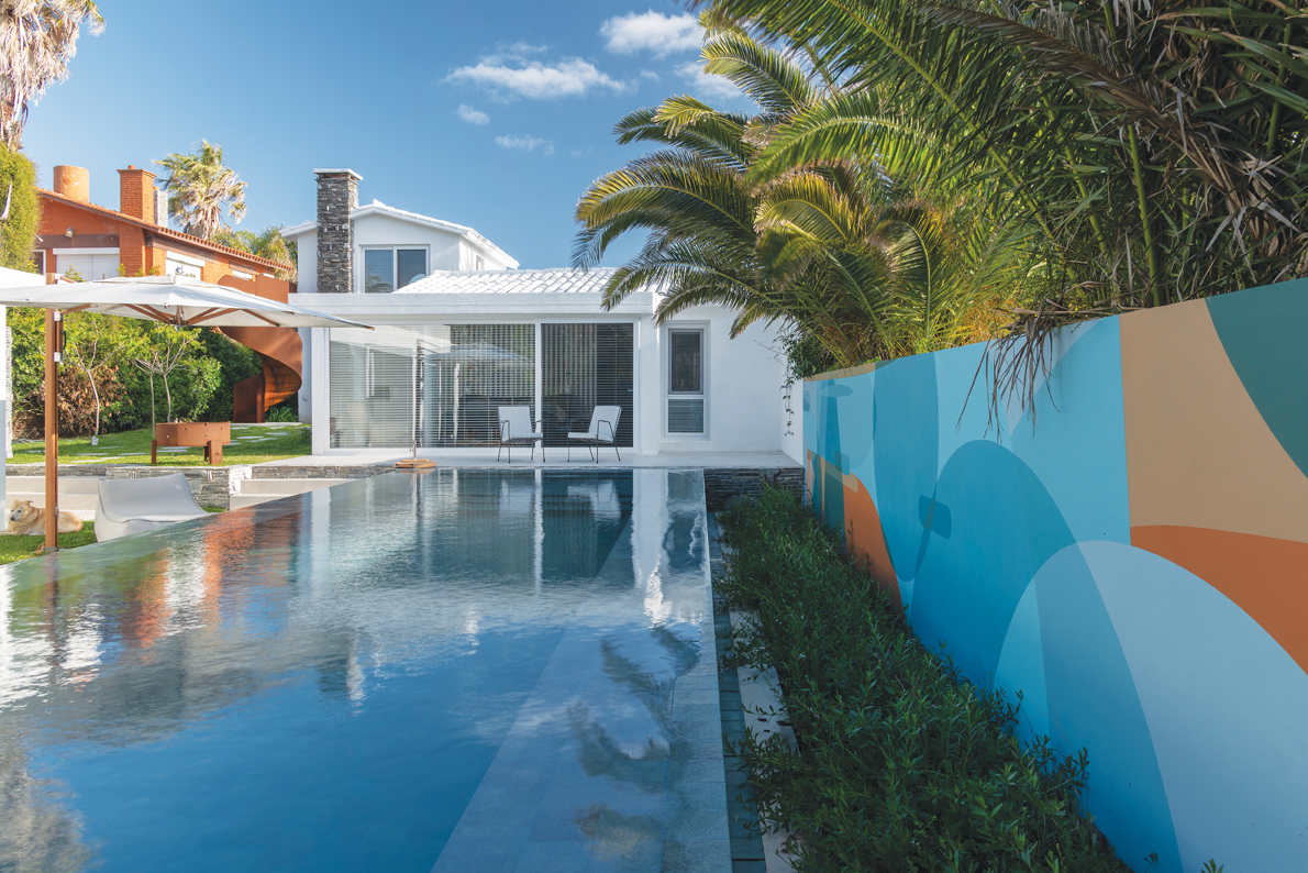 La pileta elevada de borde infinito recorre todo su perímetro y se retroalimenta al caer en la canaleta inferior. El mural es del artista callejero Marco Heis referente del Street Art.