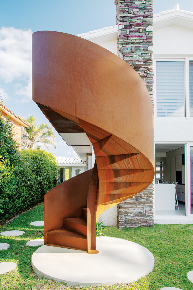 La escalera de acero corten fue trabajada como un objeto escultórico diseñado por el estudio. El chalet, en su forma original y con sus tejas, fue preservado; su carpintería es de PVC Rehau (Window & Floor, Punta del Este).