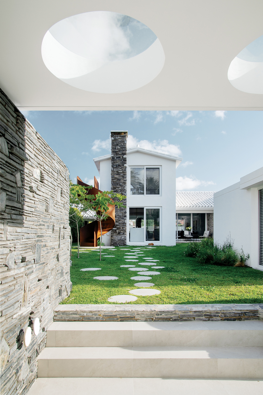 El volumen nexo, que conecta el cuerpo central con el dormitorio, se trabajó con la piedra original y el sello del estudio: el círculo en acero corten.