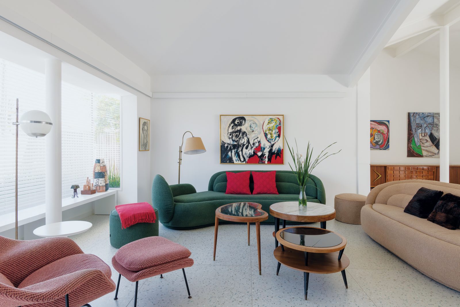 Una obra de tonos intensos del artista Ramiro Oller (Galería Jacques Martínez) preside la entrada al espacio principal y da la bienvenida a los visitantes. La pared —antes inexistente— organiza el área y, del otro lado, alberga la inmensa TV del living Bang & Olufsen.